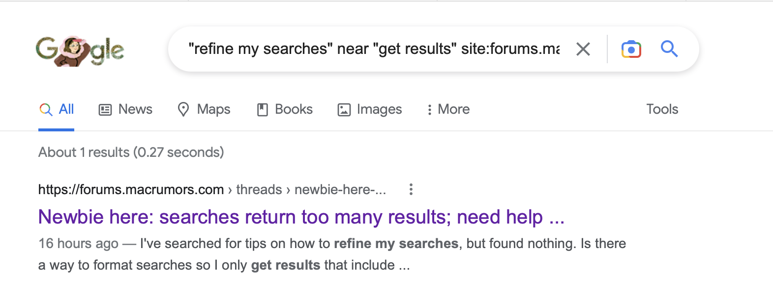 I use this custom Google search of MacRumors for that type of query. Works much better than the somewhat limiting built in forum search.