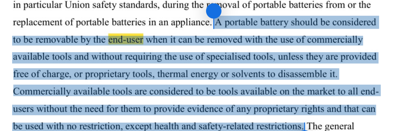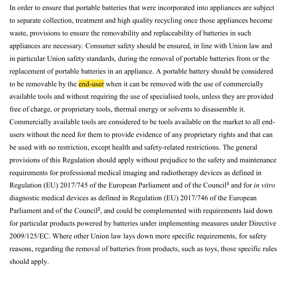 The entire back plate is the battery. It has a gasketed contact with the device to provide power, and the device back is solid to prevent dust and water intrusion. It snaps into place into a gasketed fiting, and can be removed with a small putty knofe or a cheap tool the manufacturer sells cheaply. That would meet the reg but even a reasonable price might be a 100 euros given the design. Unless knockoffs are colour matched they are likely to be less popular, plus the anticipated demand for a battery that only fits one year’s model is likely not to be very economically viable to knockoff.