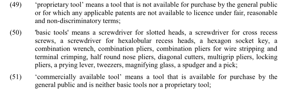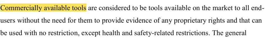 The questions are: “Is the economic operator responsible for providing any specialized tools or the original device manufacturer?” and “if a manufacturer offers the tools for sale to anyone does that make them ‘commercially available?’”