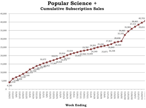 Based on the graph, Popular Science appears to have been adding new subscribers at a fairly constant rate of about 700 per week during the several months leading up to the debut of iOS 5. But more than a month after the significant bump immediately following iOS 5's release, the magazine is still seeing subscription growth at nearly double the rate seen before the arrival of Newsstand.The chart comes to us courtesy of Mag+, Bonnier's tablet-publishing software business. And as Mag+ CEO Staffan Ekholm points out, the really promising indicator for Pop Sci isn't the one-week sales leap of 13 percent -- it's that the the magazine's growth picked up after that week, with more velocity.