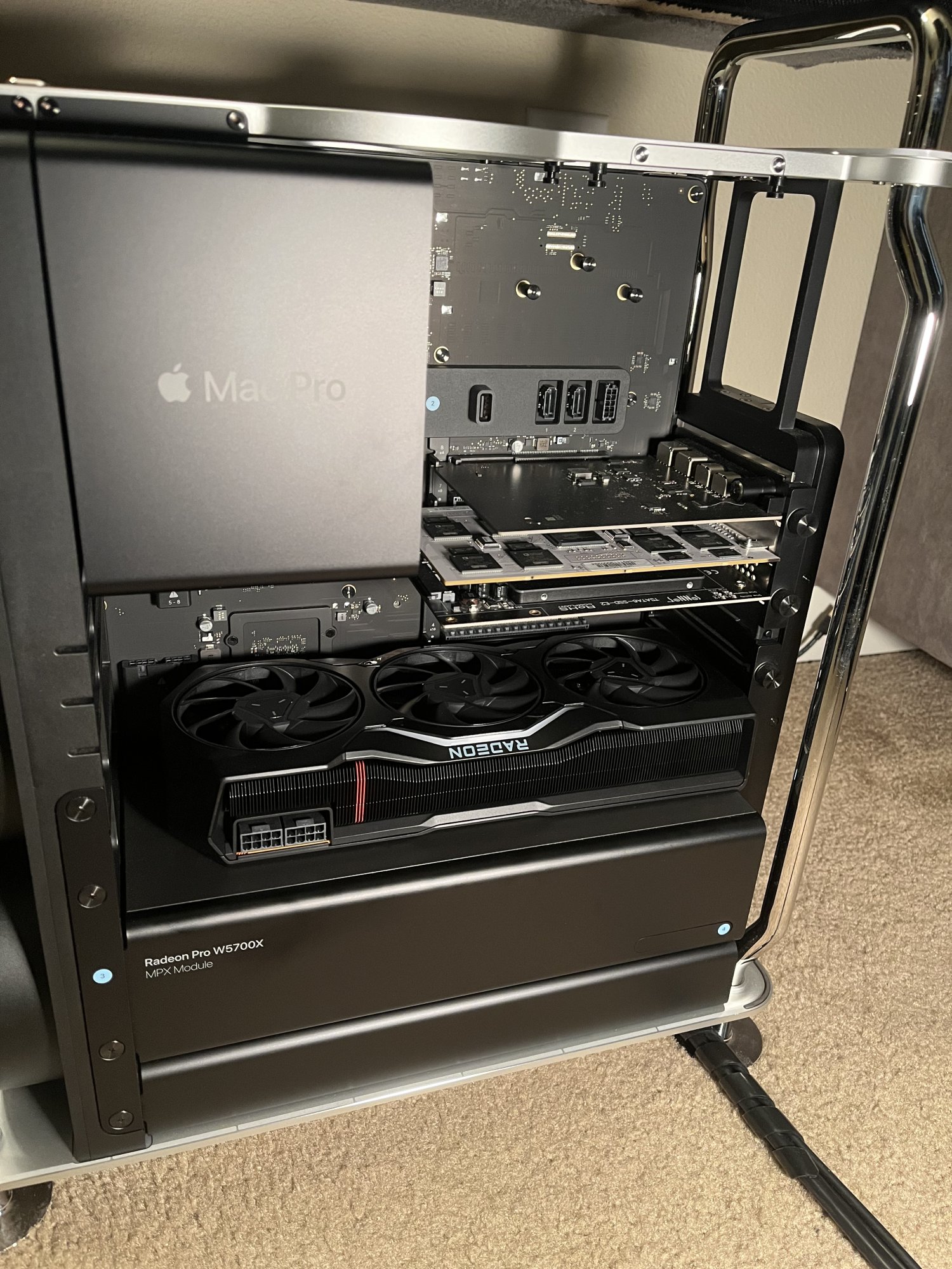 Seems you are forgetting that Radeon RX 7900XT GPUs to this day only work with Windows, no one have a clue if/when macOS will support it.Hello, can you please advise of the make and model number of the 7900 card? Also, by looking at the picture of the Radeon Pro W5700X installed and the Radeon 7900 card installed at the same time. The Mac Pro should be able to accommodated two 7900 cards without any issues? Just as long as you can figure out how to power both 7900 cards safely! I am inquiring because I would like to purchase two 7900 cards and install them into my Mac Pro 2019. Thank you very much for your time!