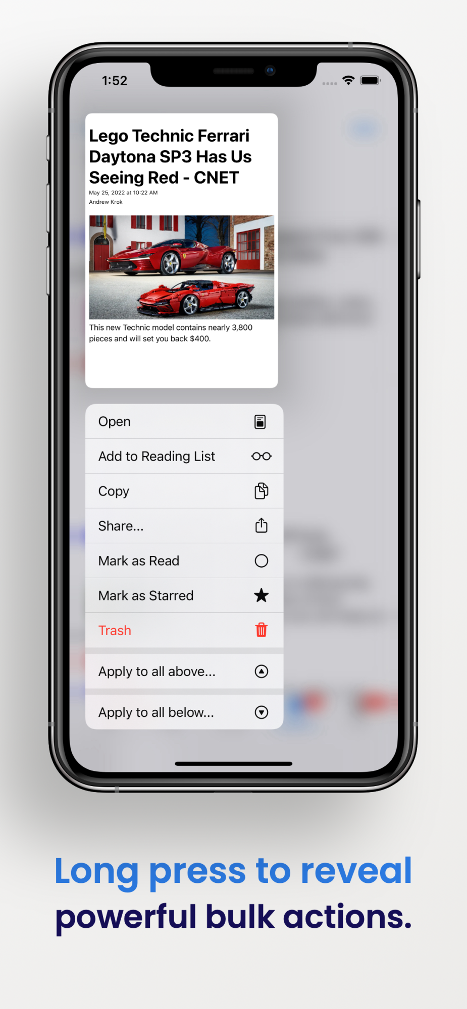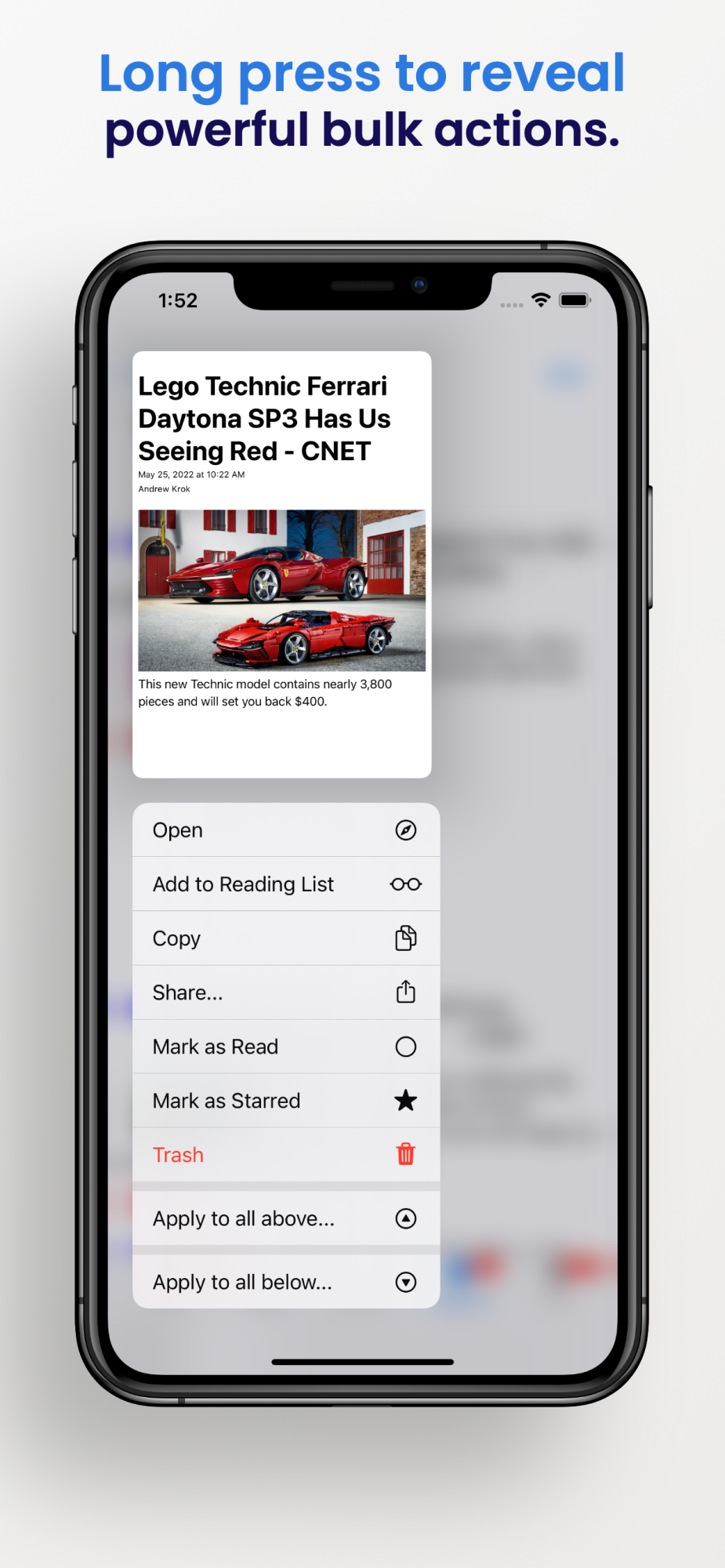 •Apply powerful bulk actions to an entire feed, an entire custom category, and even to an entire section of content by using the context menu shown when you long press on screen.