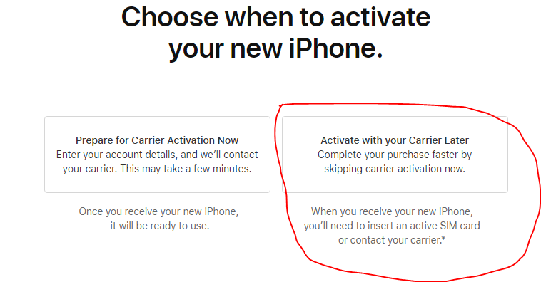 Now if you choose the "Activate Now" this will prompt you to enter your carrier info on apple.com and when you select in-store pick up. And when you actually go pick it up, the POS device will detect it and when you tell the sales you want to activate later, then you have to activate with the sim card it came in.