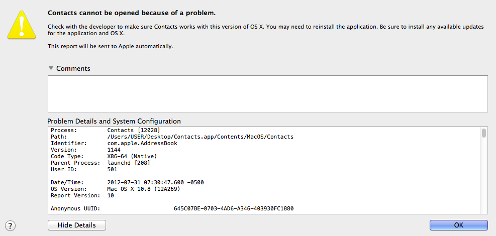 TOOK IT OFF DESKTOP-TRASHED IT- TRIED TO OPEN THE ONE IN APPS FOLDER ON HD. DIDNT WORK. I PUT AN ALIAS OF CONTACT APP ON DESKTOP-STILL NOT OPENING.