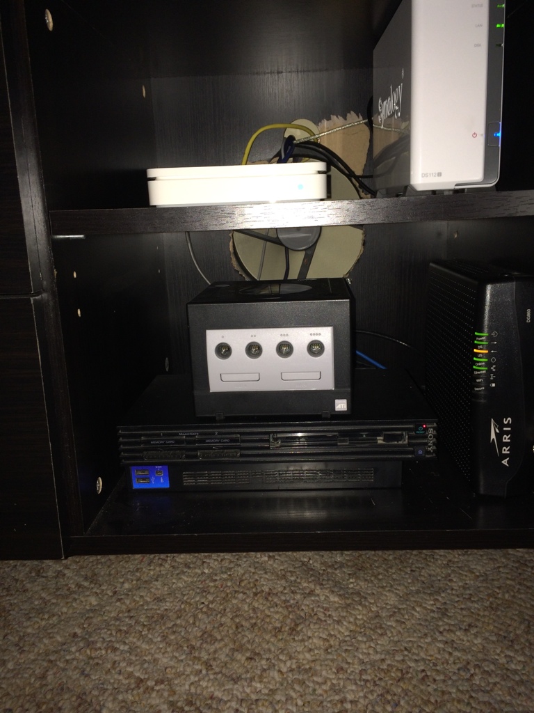 I crammed my PS2, gamecube, airport, NAS, grossly oversized gateway all in the tv stand, behind a door, with the rear panel cut away to fit a giant ass fan.