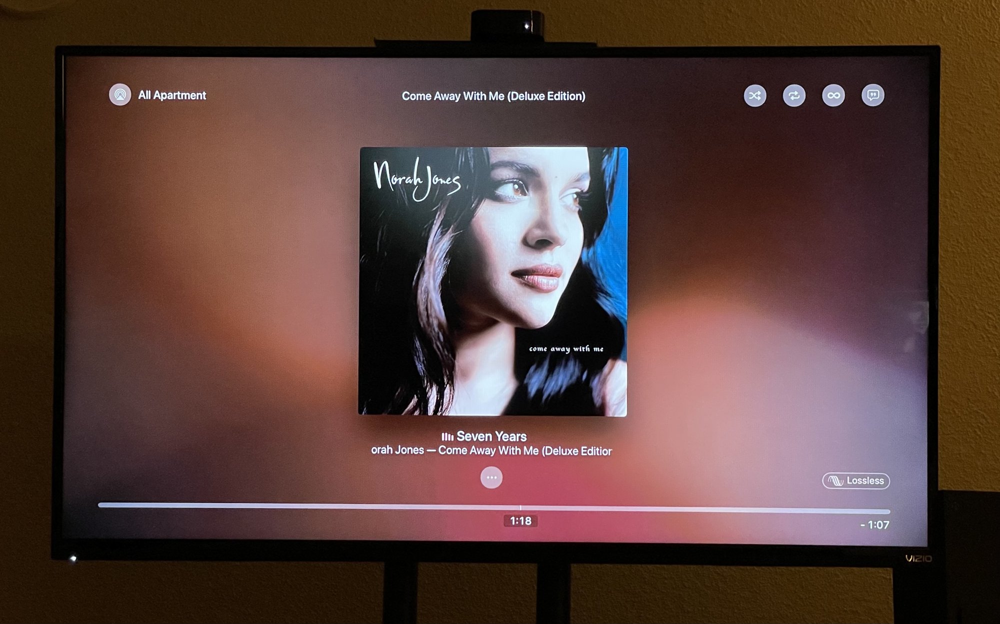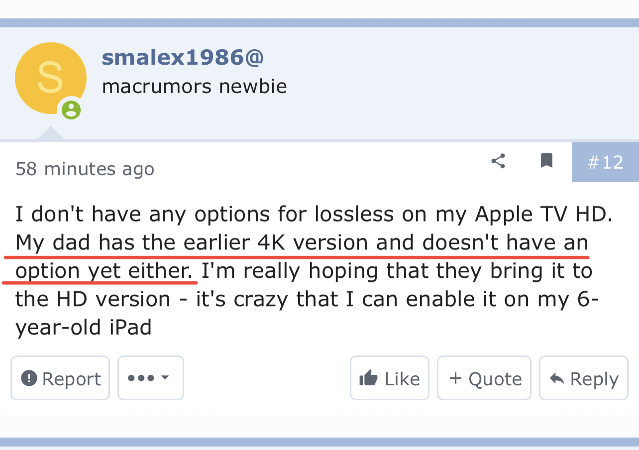 This is not true. I have a first generation Apple TV 4K with tvos 14.6 and can enable both lossless and Atmos in the music app settings of the Apple TV. Most likely he lives in an area where it hasn´t roll out yet.