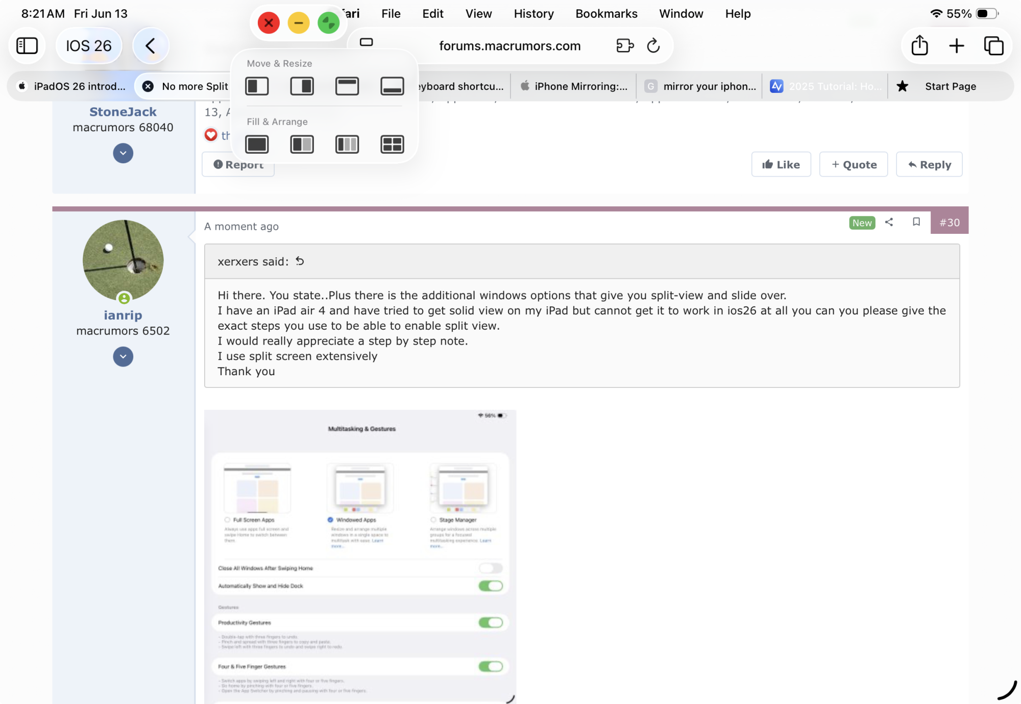 I have an iPad air 4 and have tried to get solid view on my iPad but cannot get it to work in ios26 at all you can you please give the exact steps you use to be able to enable split view.