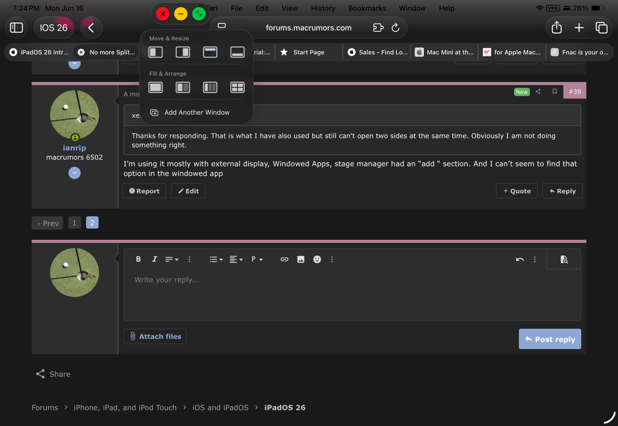 I’m using it mostly with external display, Windowed Apps, I previously used stage manager and that still has an “add another window “Thanks for responding. That is what I have also used but still can't open two sides at the same time. Obviously I am not doing something right.