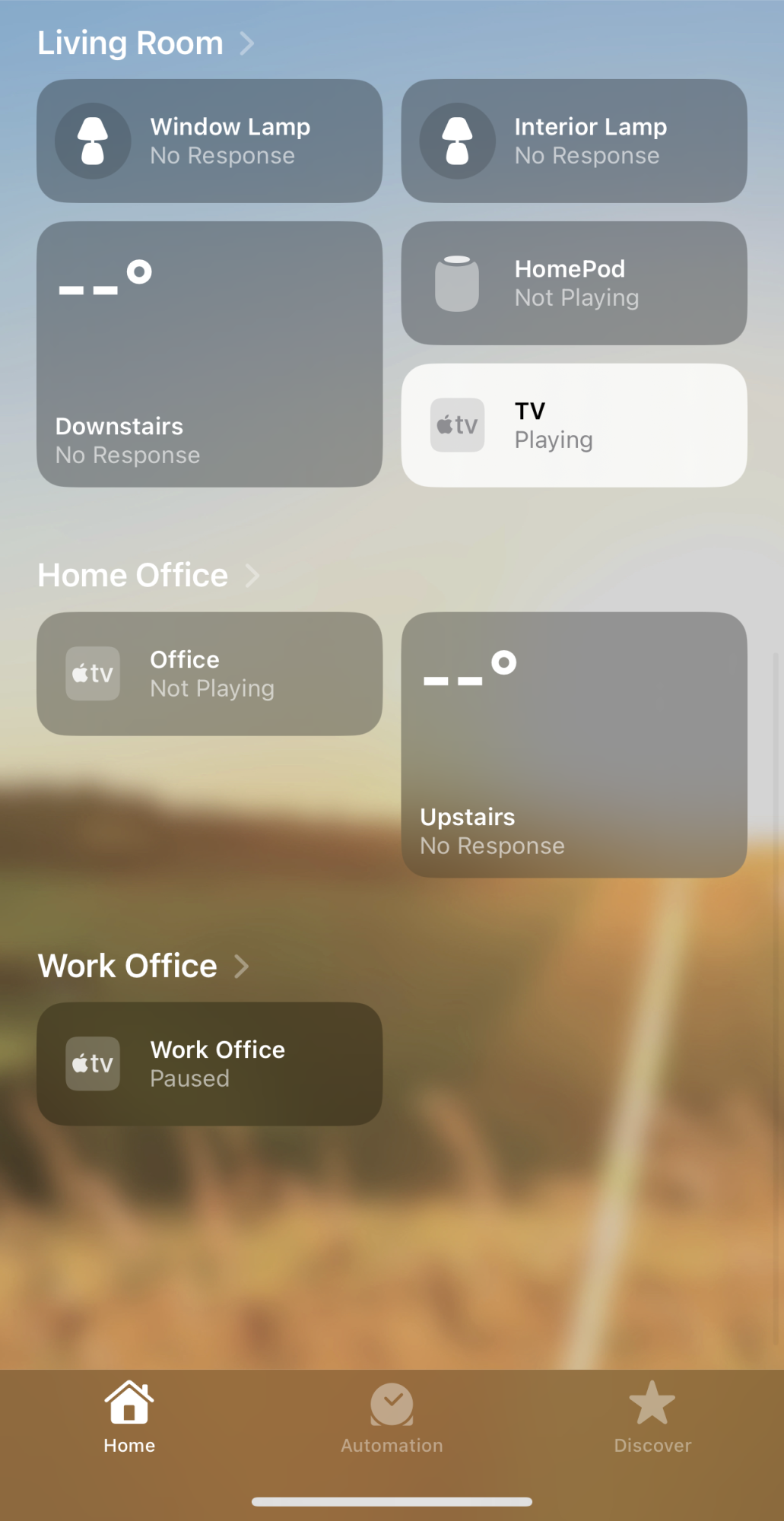 Has anyone had any issues with general HomeKit functionality since updating to the new architecture? I did the update on my end a couple of weeks ago and since then most of my devices haven't been working right through the Home app. Devices show up as No Response all the time. It used to be that I could play something on a HomePod and it would shake everything loose and all start working again, but now that's not working anymore. Siri commands work, but the app itself won't show anything other than No Response almost all the time (see screenshot). All of these devices are working fine in their native apps, just falling down in the Home app.