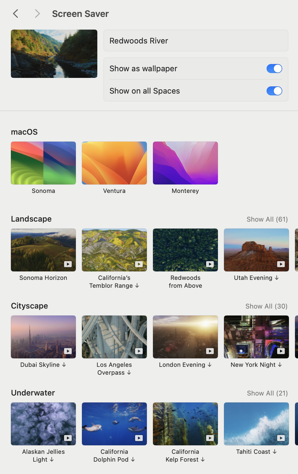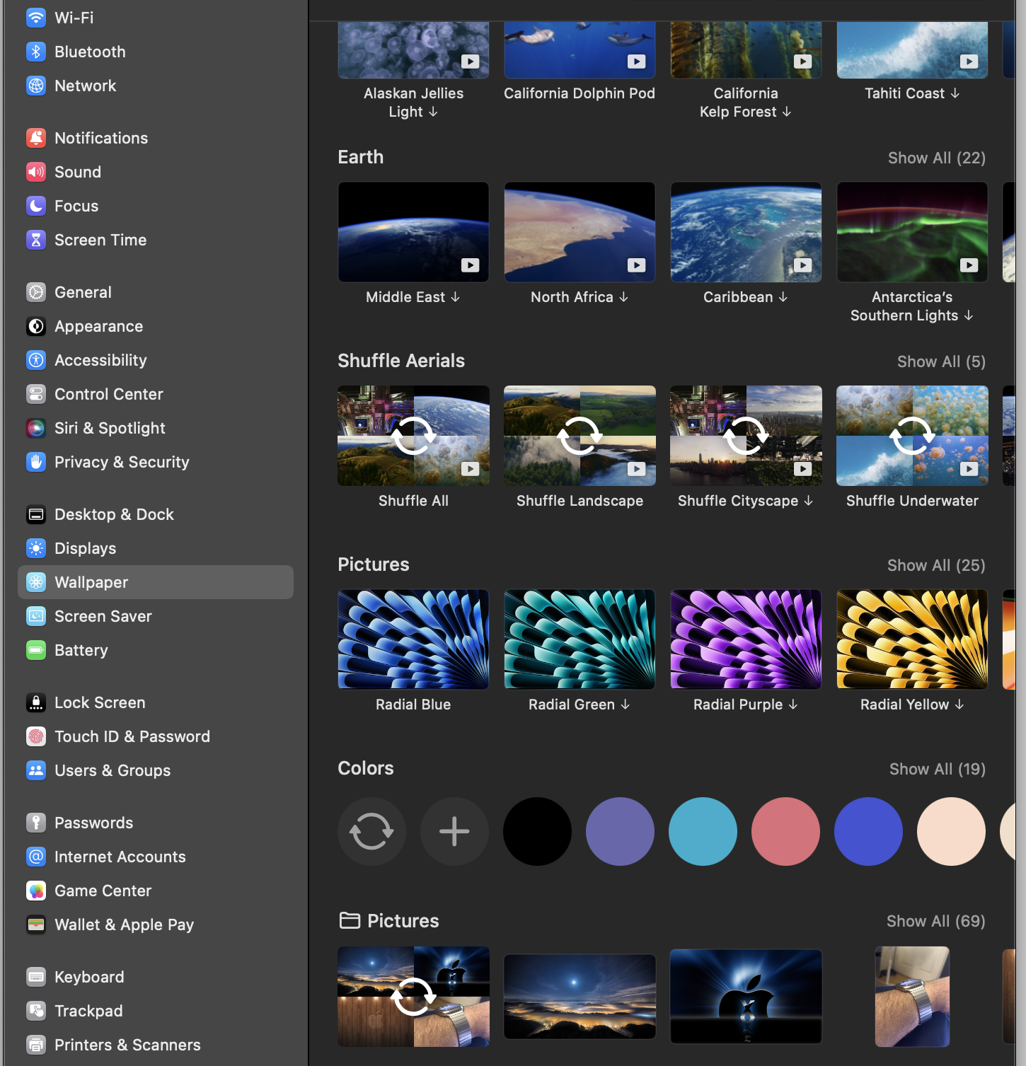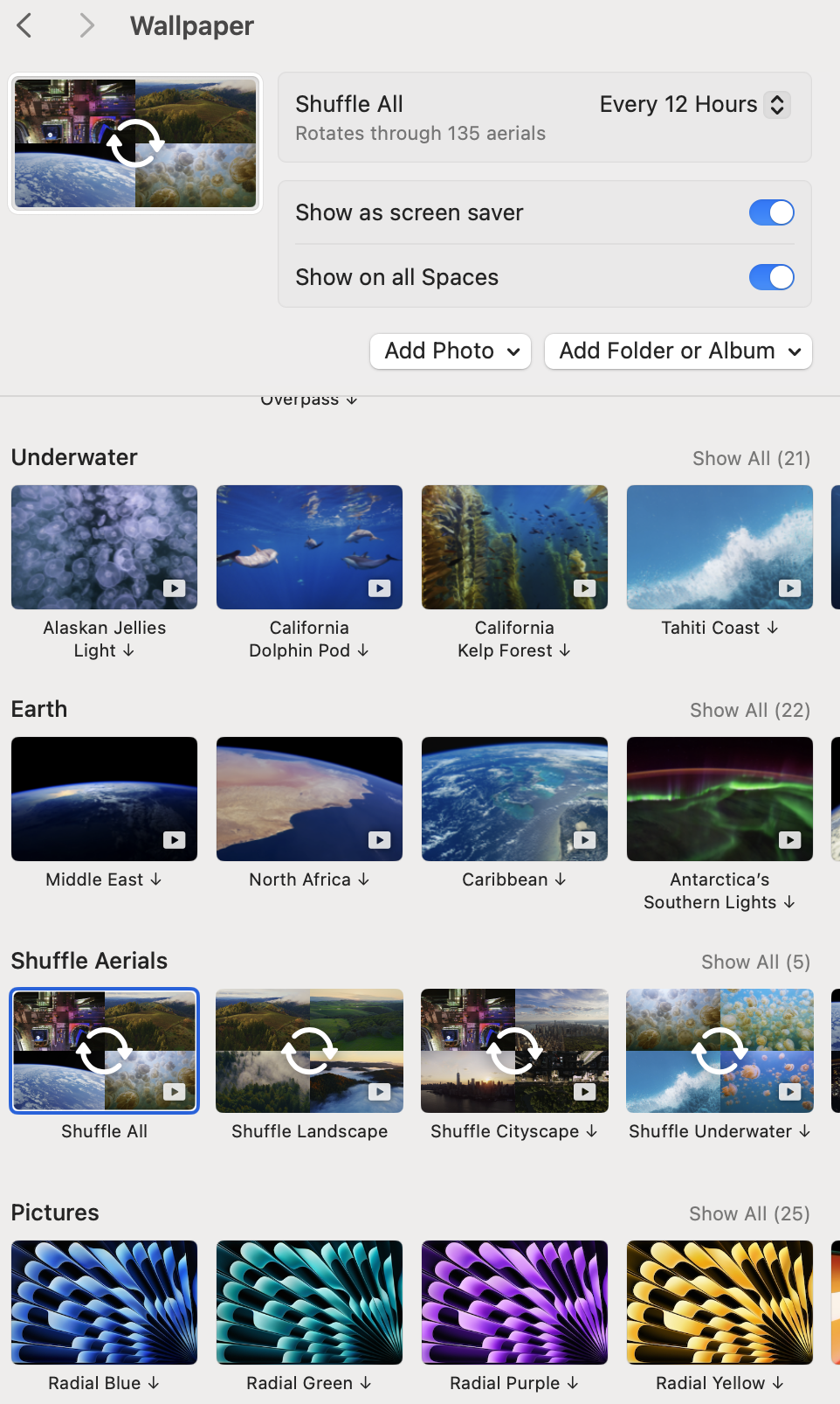 MBP w/ M2 (if it matters) running latest Sonoma release. Downloaded a few wallpapers/screensavers, but I don't have the option to shuffle them like I've seen in various YouTube summaries of Sonoma features. I've downloaded several Landscape options.