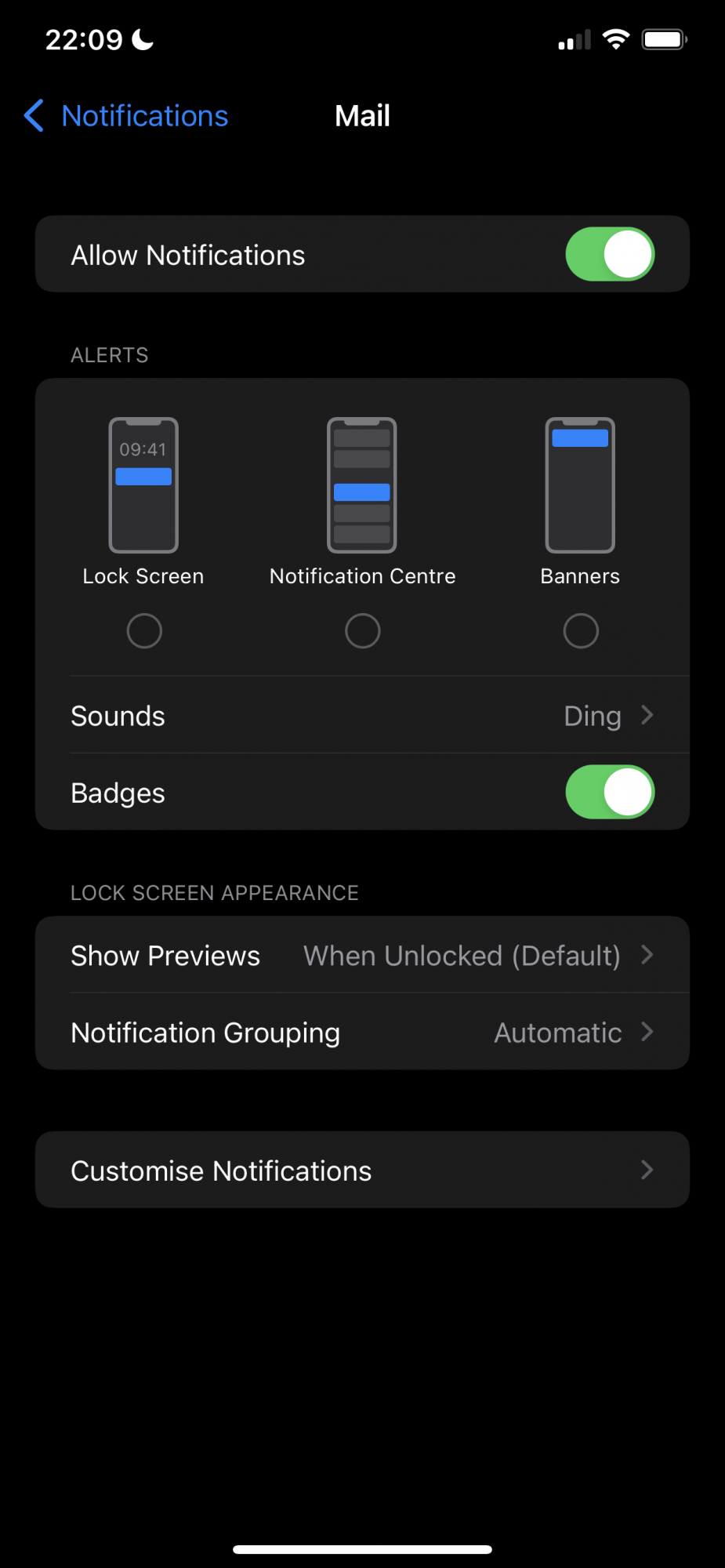I was having issues too, just upgraded to IOS 15 and I wanted a ding when a mail arrived, but no alert / notification to pop up (as I had on ios 14). I spotted the customise notifications area, and set "alert" with a sound for my email account, and when the phone was unlocked it worked (i.e I got a ding, but no alert), but when it was locked I got nothing.
