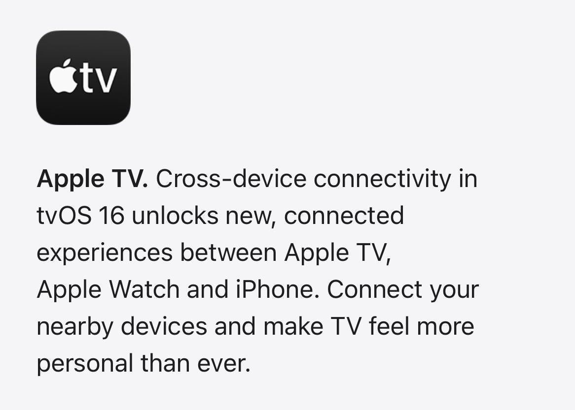 Nothing that interests me in any of that, not that I expected much to begin with. Hopefully they fixed a few bugs. As far as that goes, none of the OSes they are updating seem to have anything new that is worthy of catching my attention. I'll be happy if they just fix bugs!tvOS 16 – new features