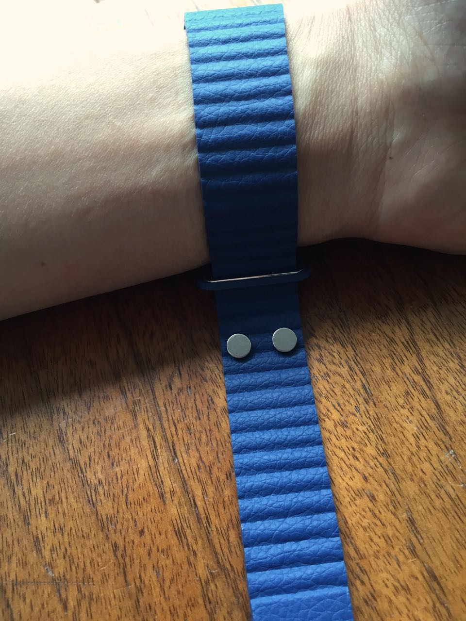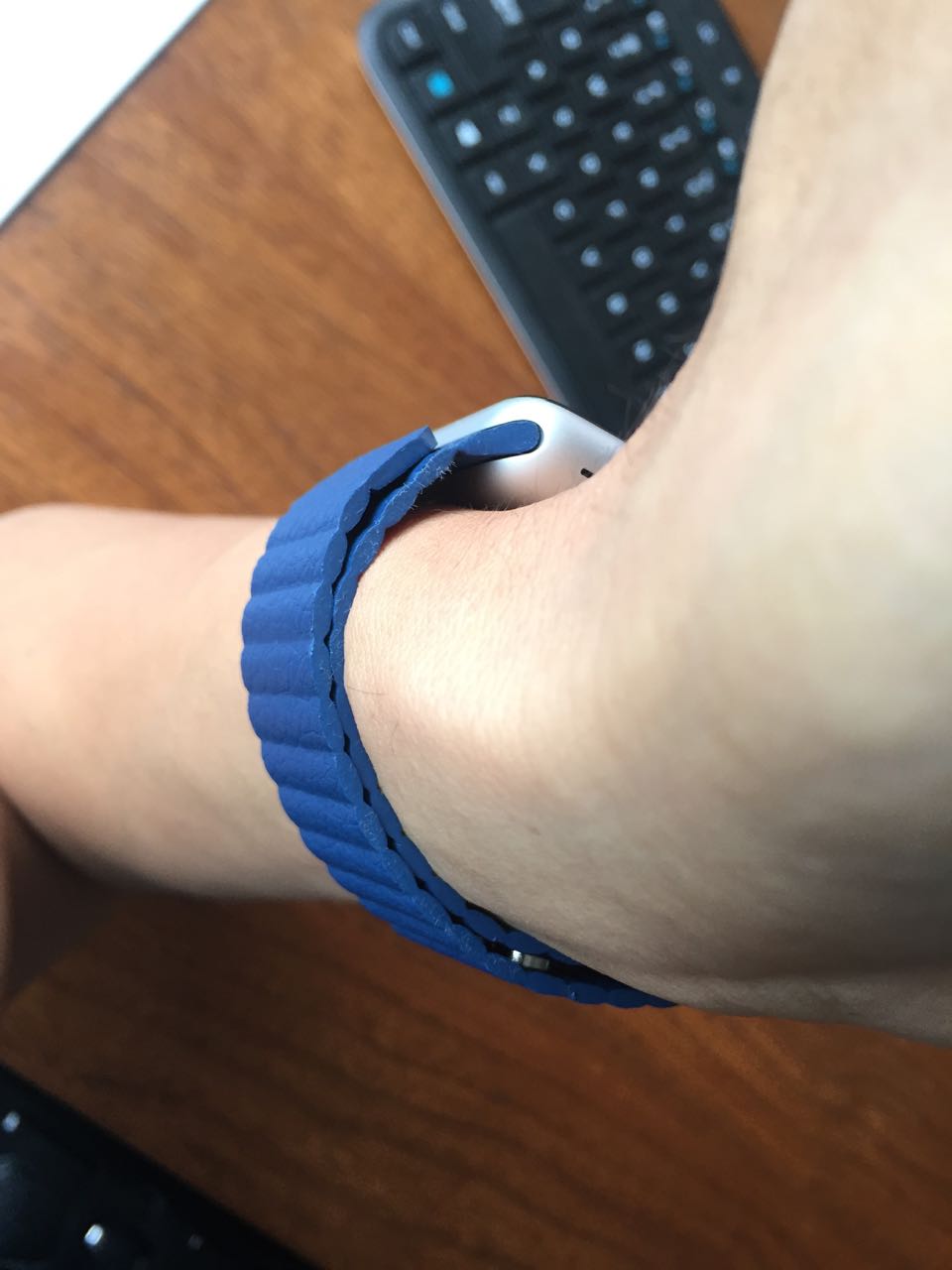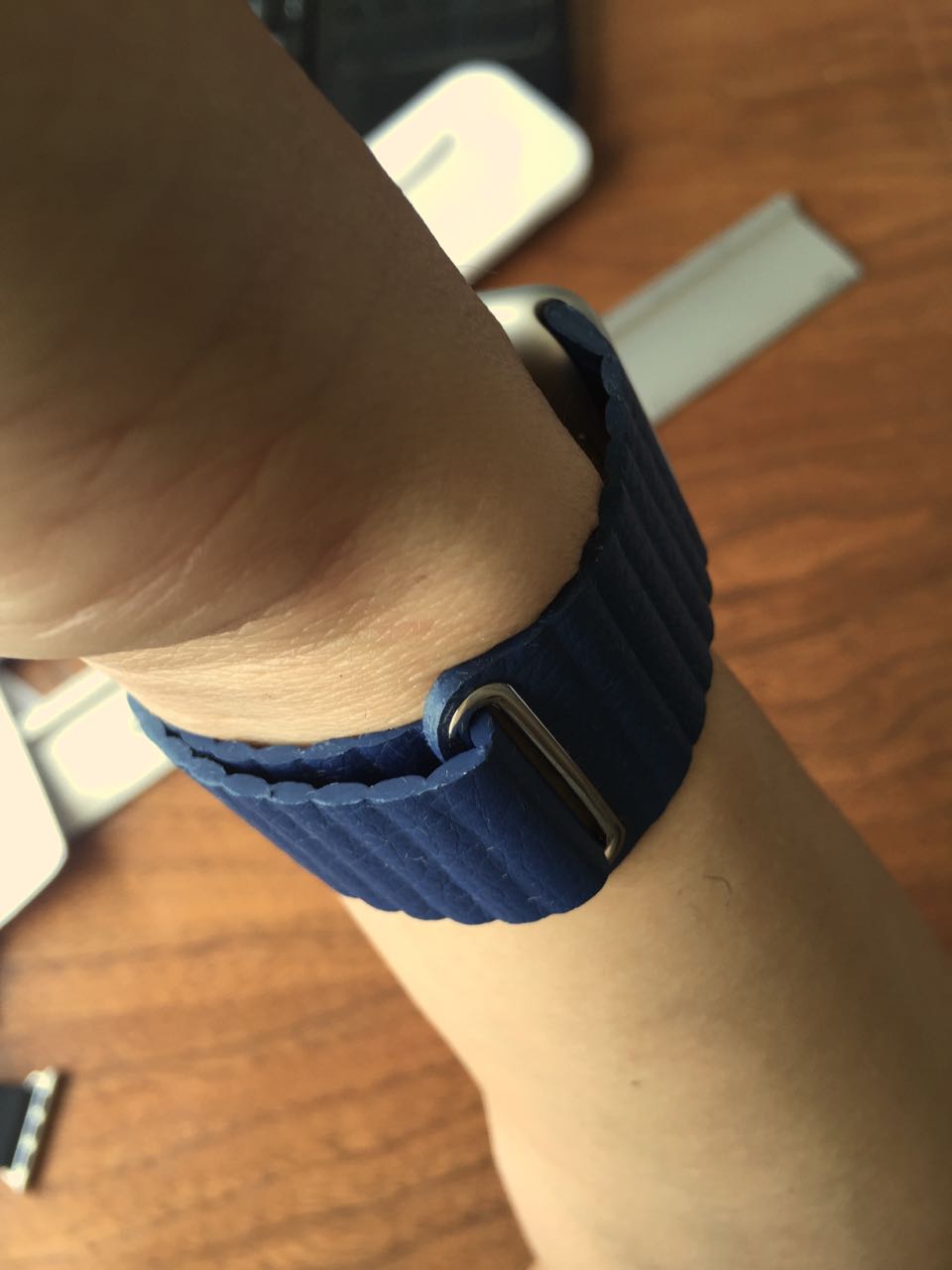 adapters, the white fluoroelastomer that came with my Watch and now, this leather loop. I have to say, there is something very elegant and simple about the loops that make me prefer them over the buckle straps and the fluoroelastomers. I like how they connect to the watch and stay secure with no additional hardware - ie lugs or closures. It just loops and connects to itself. Had Apple made a 38mm leather loop, I'd gladly give them my money. Instead, I'm writing this review wearing a strap that will probably expose me to lead poisoning.