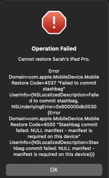 The Finder error is Fig. 1 (which is incredibly helpful, I'm sure you'll agree). The iMazing error is Fig. 2. There's a bit more info on the iMazing error, but I don't know if any of it's pertinent, or peculiar to iMazing.