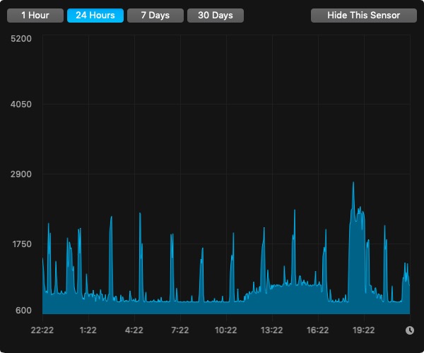 How did you get these cool graph stats?The big drop at 1830 hours above (towards the right hand side) was my boy joining a Zoom video conference and the fans kicking in.