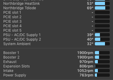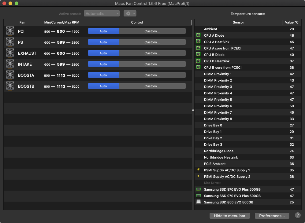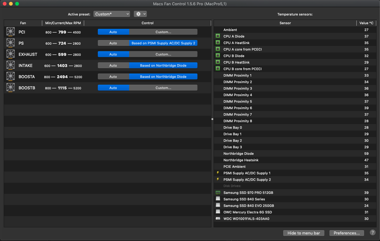 Code:Macs Fan Control 1.5.6 [Qt 5.13.2] MacPro5,1 CPU: Intel(R) Xeon(R) CPU X5690 @ 3.47GHz [6 cores] GPU: Radeon RX 480, Radeon RX 480 macOS 10.14.6 Fans: PCI-min{800}curr{800}max{4500}mode{0} PS-min{600}curr{601}max{2800}mode{2,Tp1C,32,49} EXHAUST-min{600}curr{599}max{2800}mode{0} INTAKE-min{600}curr{1331}max{2800}mode{2,TN0D,55,65} BOOSTA-min{800}curr{2255}max{5200}mode{2,TN0D,55,65} BOOSTB-min{800}curr{1113}max{5200}mode{0}
