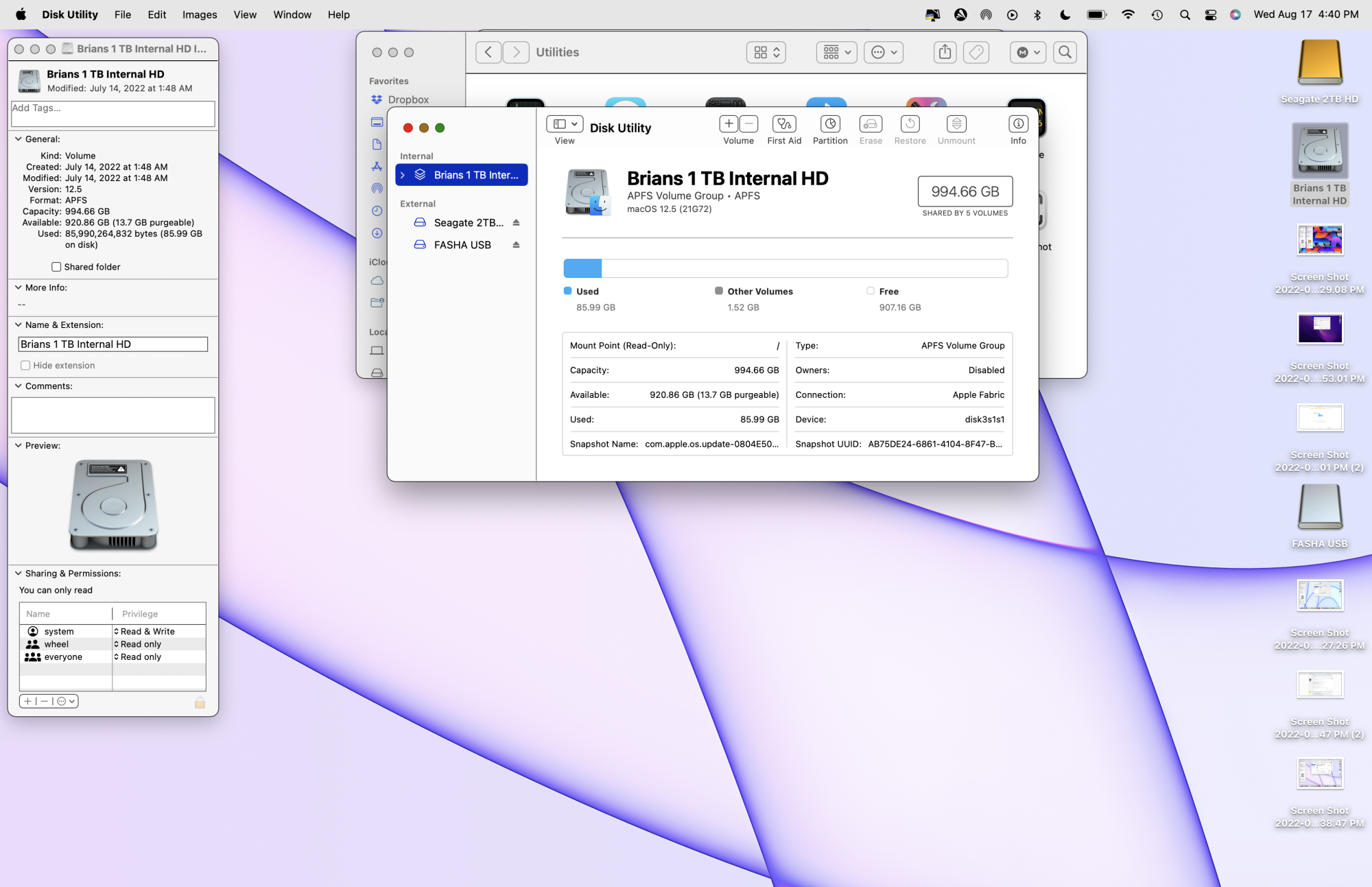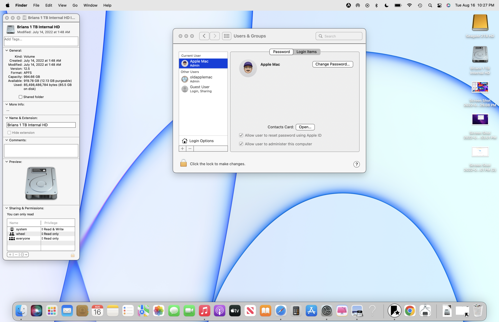 I bought the MacBook Pro barely used. I've had it for a while, just tried to copy files from an external HD that I had been using with my iMac to the MacBook Pro's internal HD. I get the grayed out circle with the slash across it. The external HD is formatted Mac OS Extended (Journaled); the internal HD is formatted APFS. I opened up Get Info on both of them. On the MacBook Pro, I am not allowed to change the Sharing & Permissions for system, wheel (whatever that is), nor everyone...they have the privilege(s) of Read & Write, Read only, and Read Only respectively. My external drive is similarly set up, just with my customized name instead of system and staff instead of wheel. However, I can freely change those privileges without unlocking anything. How do I get "the necessary permissions" in order to have control over the new Mac's internal HD. Thank you very much for any enlightenment that you can provide!!!