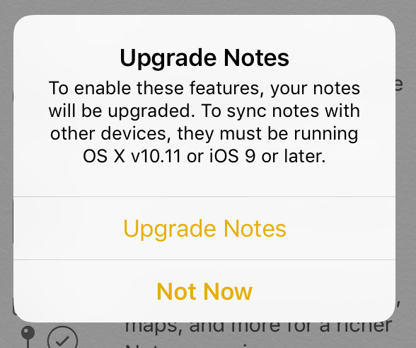 Though she never explicitly says it, she strongly implies that there is no alternative to clicking the "Upgrade" button. In other words: Apple is has now hobbled Notes and is forcing former users to click "Upgrade" to continue using the app at all.