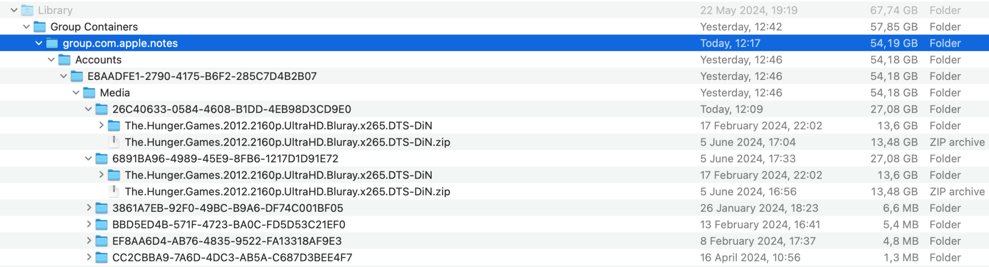 Hi, guys! Before couple of days I accidentally copied a big movie folder (or file) into a note in Notes app. I was thinking that I'm pasting a text... After I saw that the files showed up in the note, I selected them and delete them. After that I deleted the whole note even in the deleted folder. After that I noticed that I have a lot of System Data - 72GB to be exact. After some investigation reading articles and watching videos... I opened the Library folder in Users on my HDD and and I found that in Group Containers/group.com.apple.notes/Accounts/XXXXXXXX(some kind of account code I guess)/Media/XXXXXX(another code) there are two folders of 27GBs. And inside them there are a zip file and a folder of the exact same movie I accidentally copied in the note a couple of days ago. I deleted even the original folder of the movie (yes, from the bin also) and even after that the video file is playable from those two folders. That's very odd for me! I guess that I can delete those folders but I don't feel really comfortable messing around with system files and folders. I found similar problems on the web but no solution. It will be helpful if somebody can clear the things for me. I'm using macOS Monterey 12.7.5 on MacBook Pro Mid 2015. Thanks in advance!
