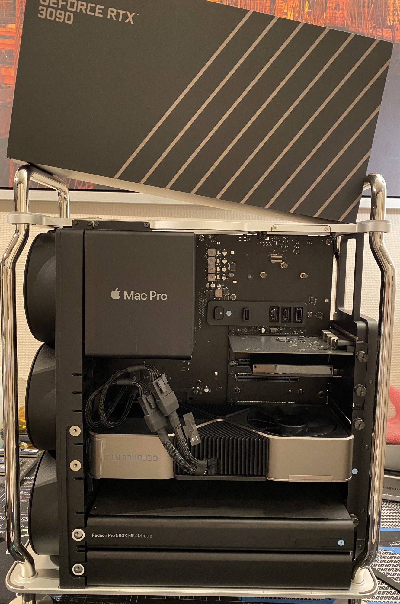 - Good thermals, card stays under 75 degrees. Increased noise under full load, but not too bad. Left out the PCI covers under the card to help thermals, no need to adapt MP fans. Card is completely silent when running under macOS