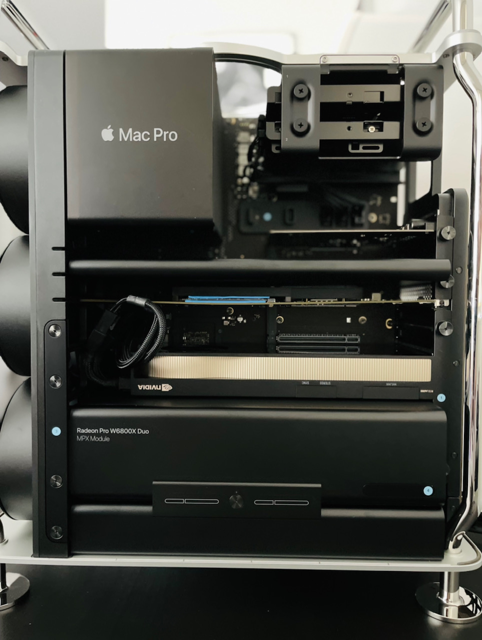 I'm thinking of a similar configuration. Is W6800X (not a duo) and two A6000 possible? What problems do you have with MacOS when you use A6000?For those who installed the Nvidia cards (I installed A6000 and it worked really well in bootcamp), when you are in Mac OS (I used app to make my mac never sleep due to sleep crashing issue with Nvidia cards), I find the Nvidia card is really hot to touch (doesn't matter if I place it in slot 3 or slot 4) - is that normal even if the card is not used?? Also, it seems I'm getting 10% less performance on the MPX module if I put in the Nvidia card in slot 3 or 4, not sure if this happens to anyone else and wondering why may be the case?