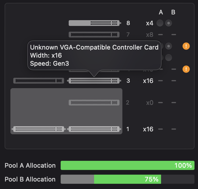 This is beyond me, but do you get any indicator of why the ! are there for 4 and 6 if you hover over them? Or is that also b/c it doesn't recognize the card. But I will say that Nvidia card looks really, really cozy with the MPX module, so I'm guessing it might be the fans' output direction? The only other place I've seen this discussed was here and here.