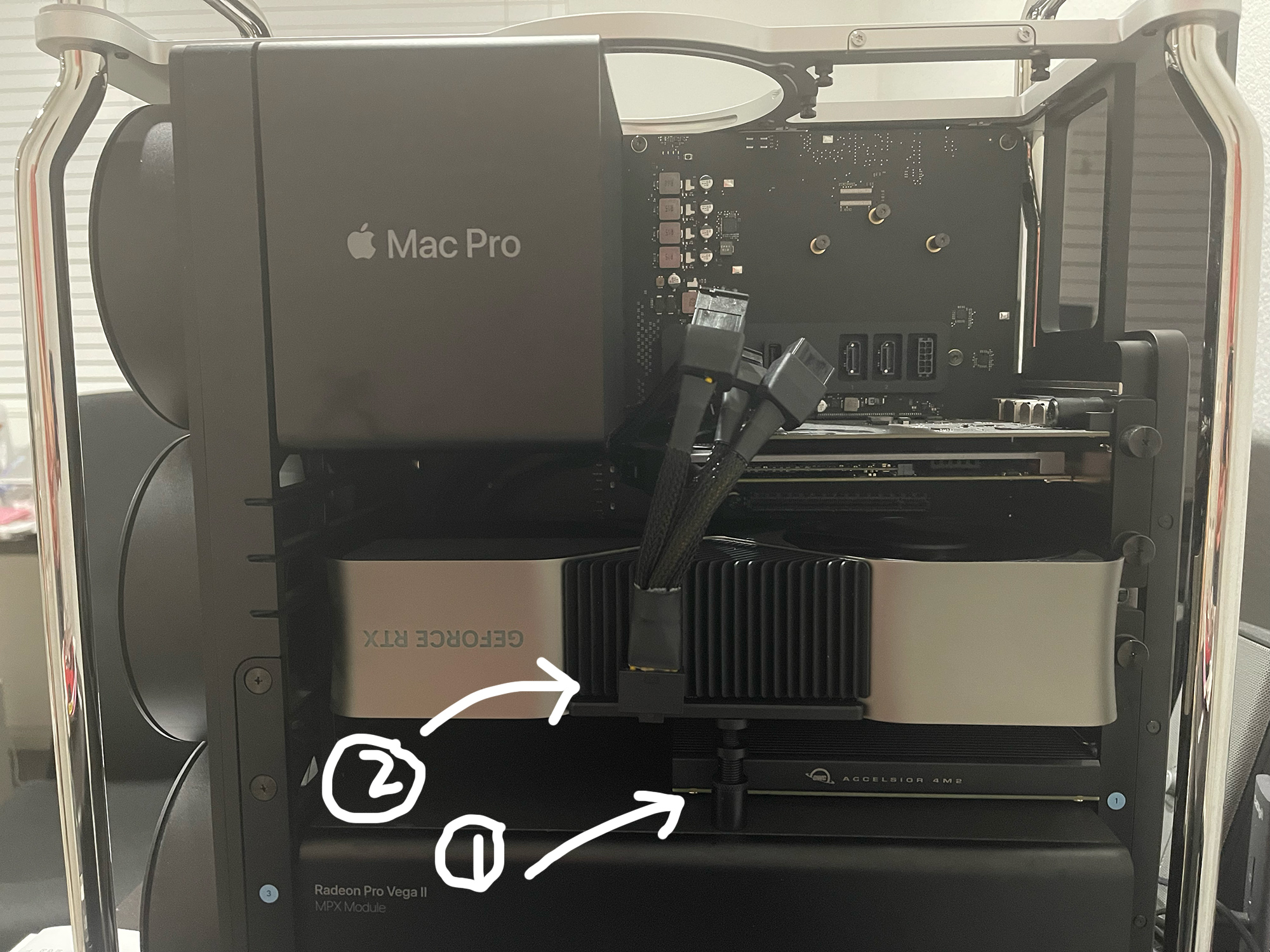 Here's another installation from another member:Sweet! I have hope againJust curious why you would put MPX module in slot 3 and the Nvidia in slot 1? Does that make it easier for the aux power cables to reach?