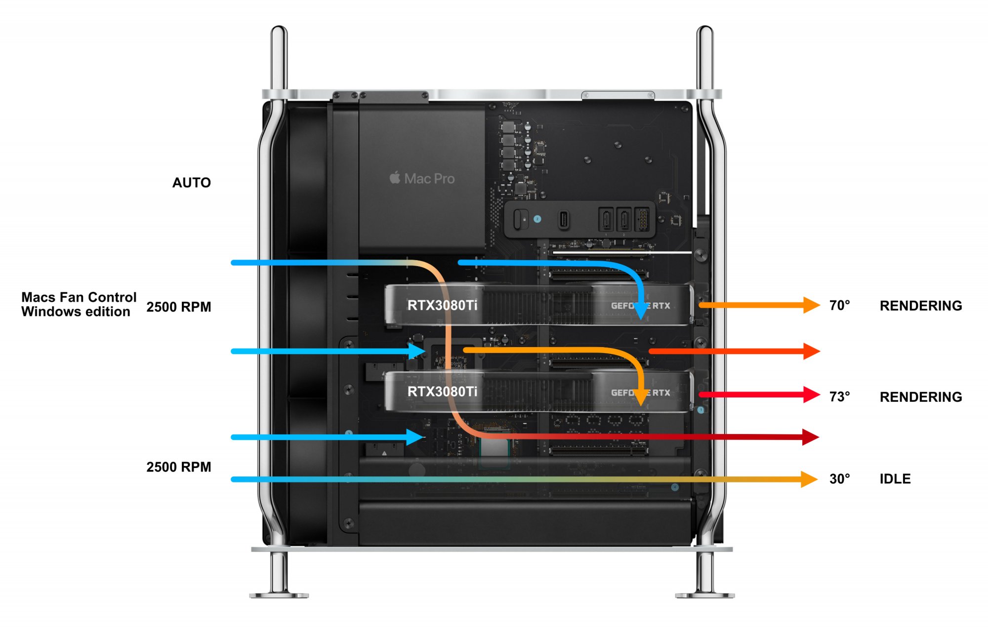 The Mac Pro is oriented differently than PC desktop cases. In the MacPro7,1, the air from the MacPro7,1 front fans will blow over the component side of the 3080. The back-side fan of the 3080 will try to suck some of that air in and blow down toward the power supply but that direction is blocked by the power supply (if you try MPX bay 1) or the MPX module (if you try MPX bay 2). Maybe there's a few millimetres of clearance? Otherwise you might want to put the card in slot 4 but that would not be a good use of PCIe lanes. Then that air is blown out the rear of the MacPro7,1 by the fans of the MacPro7,1.