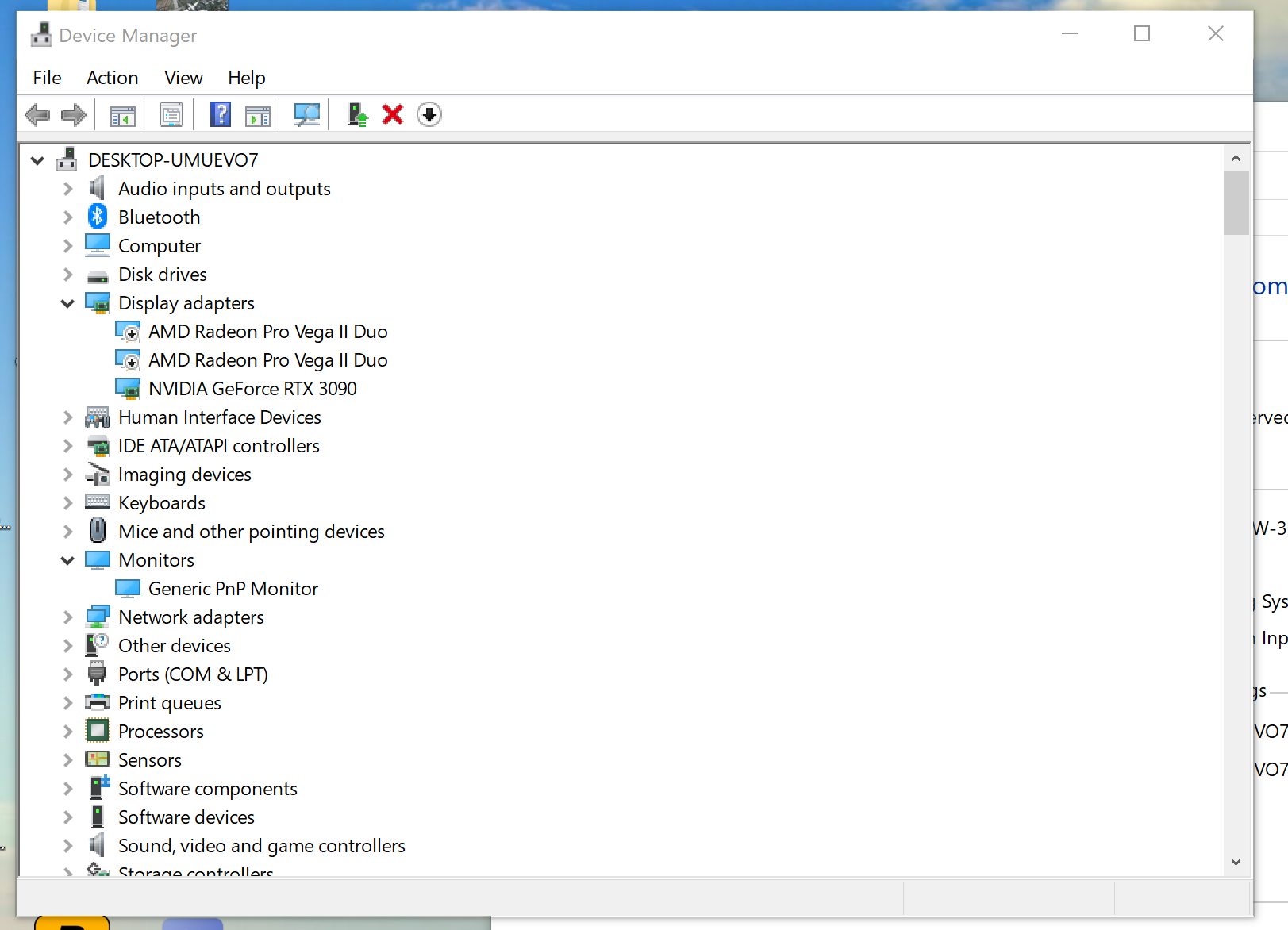 When looking at Device Manager, it helps to "view by connection" to see where the display is connected to.It was disabled, but my guess is Windows is trying to do something smart so it keeps existing displays connected. I cannot change the resolution, nor can I access the NVidia control panel. But the Vega is disabled, and the 3090 is definitely handling the rendering/GPU tasks on my TB3 monitor. Its actually a fine work around IMO, requires no cards, no special cables, just to disable the AMD GPUs after plugging to a non-GPU TB3 port. Performance is fantastic.