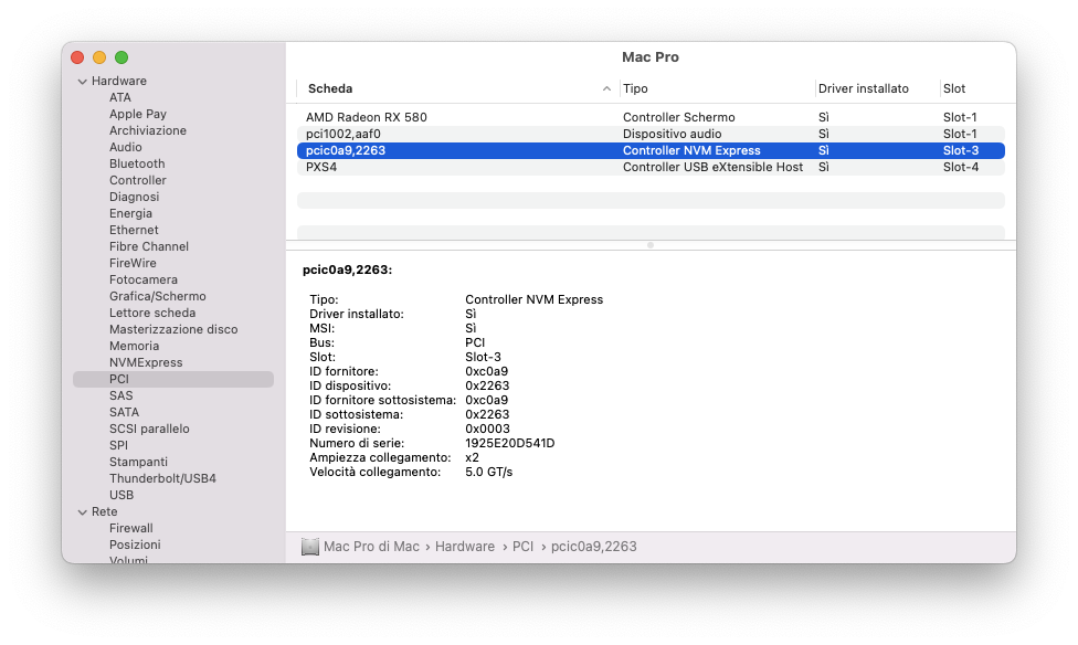 I’ve a genuine Mac Pro 5,1 running mojave updated to the latest 144 firmware and booting from a sata ssd drive. I also have an nvme drive in slot 3 (in a x4 pcie slot adaptor), but it only links at 2.5GT/s, not the 5.0GT/s the 144 is supposed to enable. I know it’s not the card as it connects at 5GT/s in slot 2 (and 1). The os isn’t misreporting the link either as speed test on the drive shows 750mbs transfer in slot 3, and 1500mbs in slot 2.