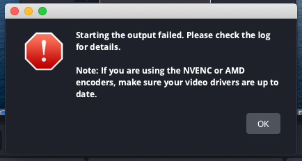 I'm experiencing a strange error with OBS on my 5,1 Mac Pro with the Radeon Pro W5500 graphics card. Every time I try to start an OBS recording/stream with the hardware encoder "Apple VT H.264 Hardware Encoder," it gives the error message in the screenshot below. I'm running Catalina 10.15.7 via the Dosdude patcher, as I was having issues with OpenCore.