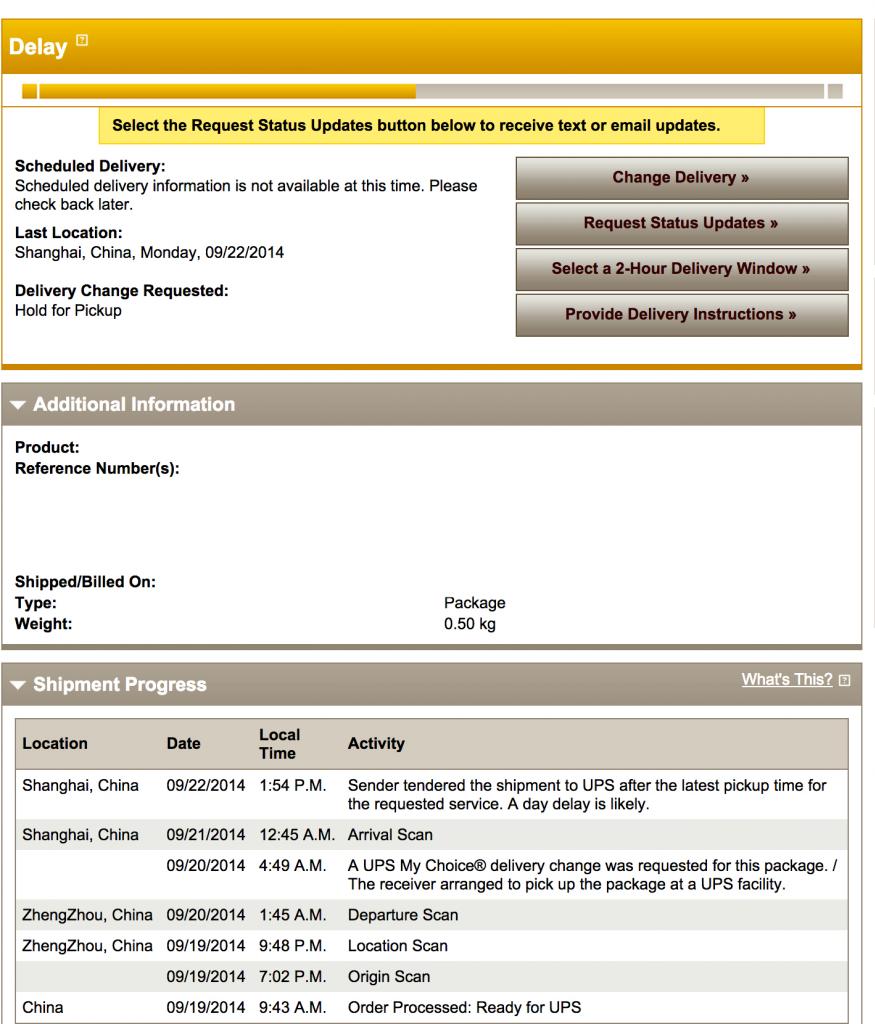 UPS Tracking info isn't very informative... My tracking says scheduled for Early Delivery on 9/22, Originally Scheduled delivery 9/23. But last scan was Arrival Scan - Shanghai on 9/21 @ 12:45am. No departure scan.