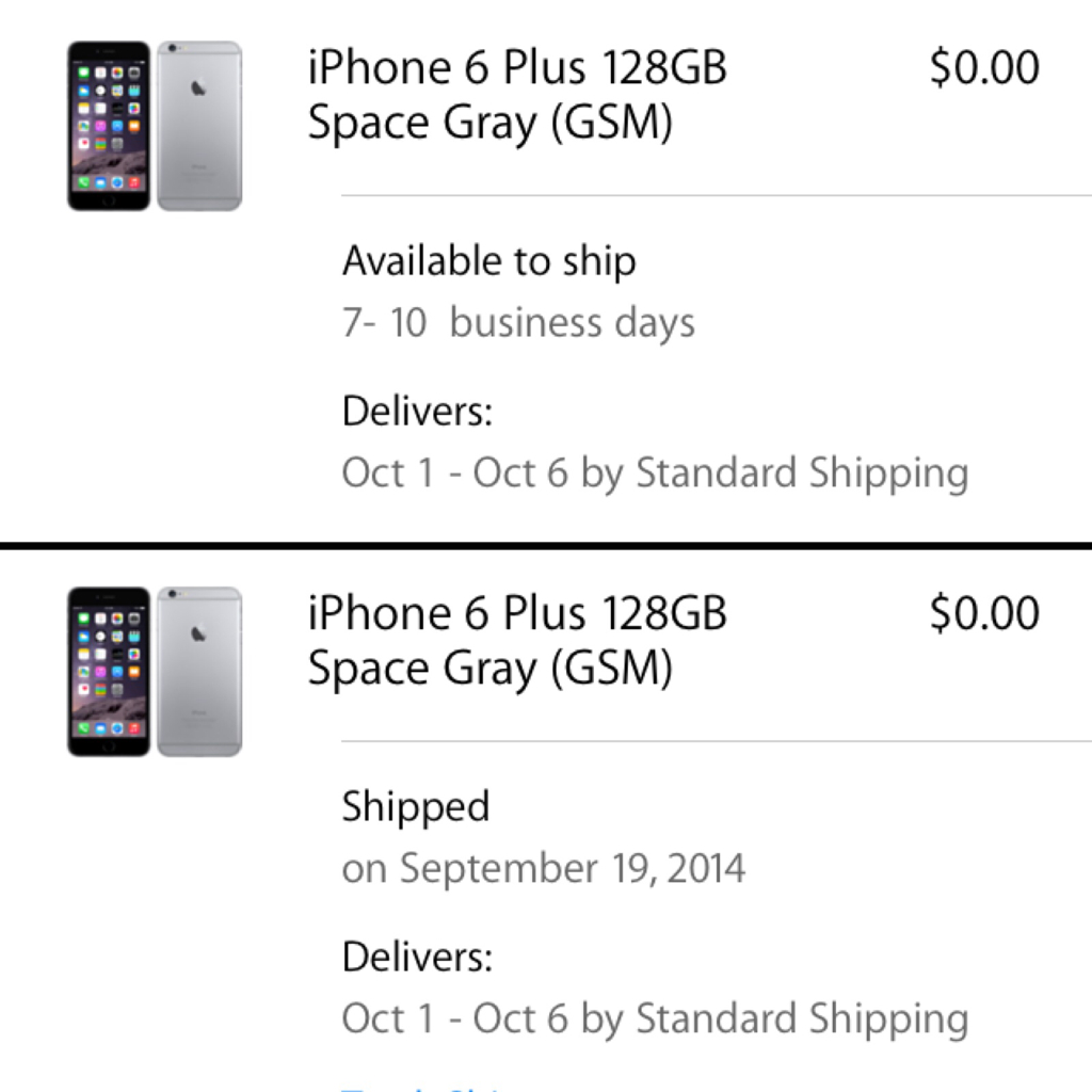 I had just checked my order status literally 15 minutes ago. It was still showing "Preparing for Shipment" Then I checked My Support Profile and see an iPhone 6 Plus listed there! I go back to the order status and... it shipped!