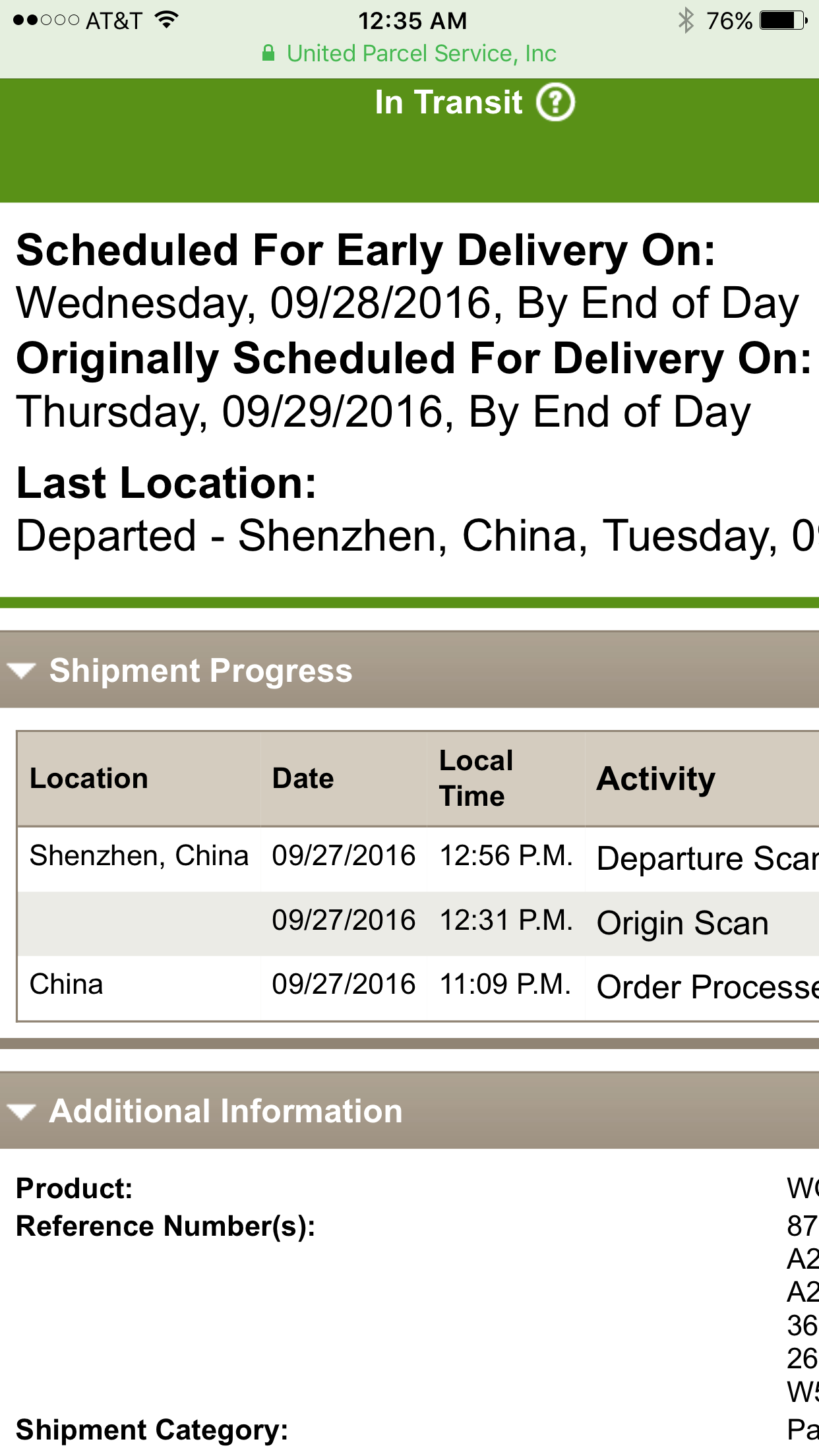 Saturday the 24th, phone status changed to shipped. It showed arrival scan (UPS tracking) to some location in China...along with a delivery date of the 27th.