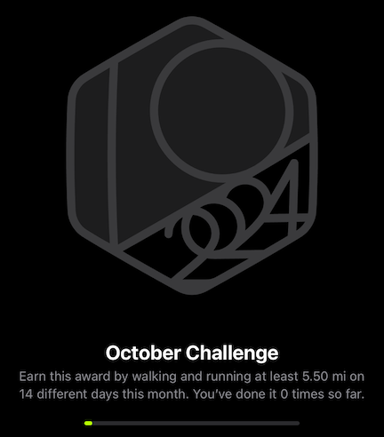 That's a good question. Last month was a bit irregular as I was on a road trip for about 10 days. Looking at the numbers I had anywhere from 3.72 miles to 7.27 miles depending on the day with an average of 5.5 miles. So I guess my challenge this month is to be average.What’s your usual distance? I’m curious because I also got a “distance for 14 days” goal but it’s substantially lower than my average.