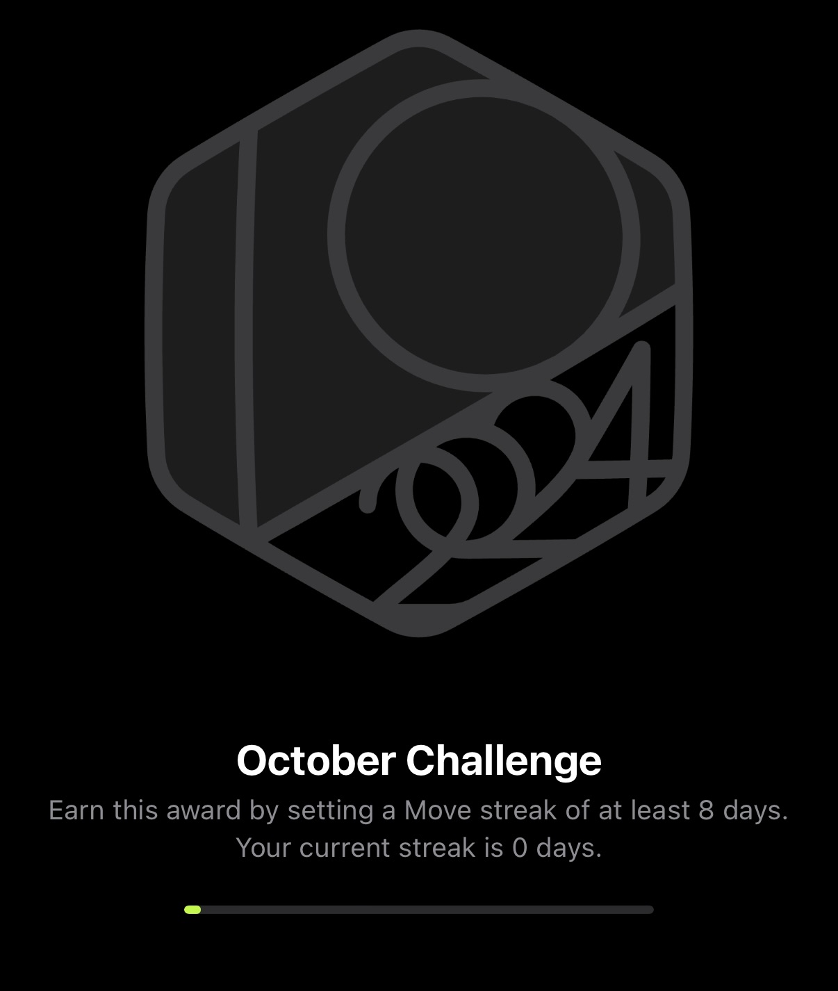 On your iPhone, go to your Activity widget (you can search for it) > Scroll down to Awards > touch Show More > Scroll to Monthly Challenges > in the lower right-hand corner of the tile touch Show All. You should now be in the Monthly Challenges screen. There should be a grayed out icon for the October Challenge next to the previous months.