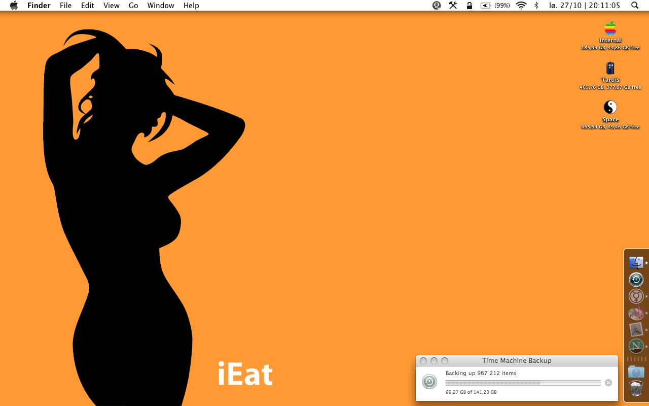 Way too much junk in the trunk for me, but to each his ownNot much difference, after adding a white stripe to the the top of the desktop background to cancel out that frelling semi-transparent menu bar, that is...