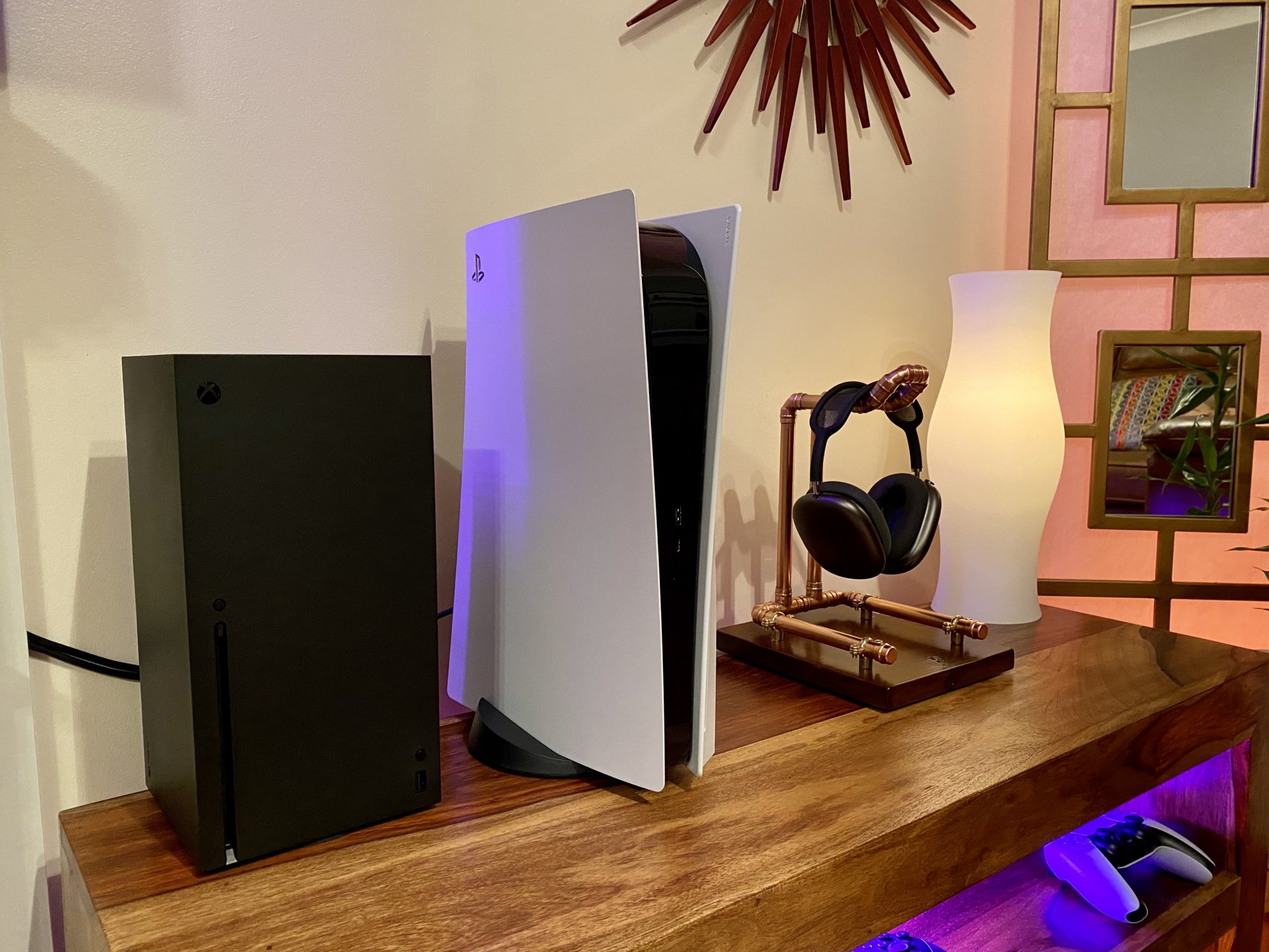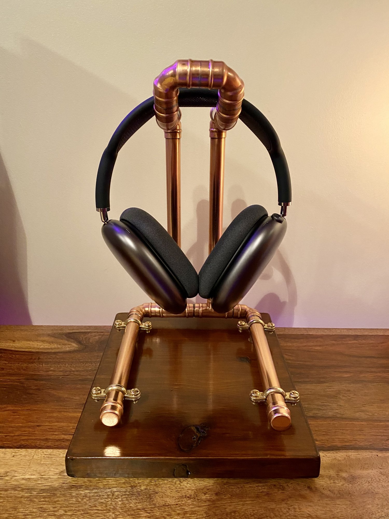 dude where did you get that stand from? Amazing. You use the airpod's with the systems at all? I did at one point, but ended up just using the steelseries arctis 7x for both. Too convenient.Something a little different from me. Bespoke stand with polished and lacquered copper body, secured onto a stained wooden base with felt lined underside.