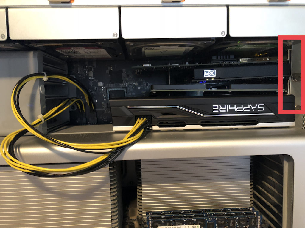 Also of note, the Sapphire RX 580 is much thicker than the HD 5870 it replaced and the PCIe card installed above it was resting on the 580's fans due to gravity droop, in addition to being a PITA to install with almost no clearance. I used one of its plastic connector covers as a temporary spacer. When I replace the cable, I will try reseating all cards with the case lying on its board-side down and see if the cards stay level horizontally.
