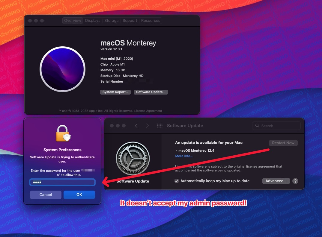 I get the upgrade notification but a window asking for my admin password is showing up saying I can't upgrade because my admin password is not working. I'm the only user, the only password I have since day one, and now I can't use it to upgrade the OS! Can someone explain this to me??
