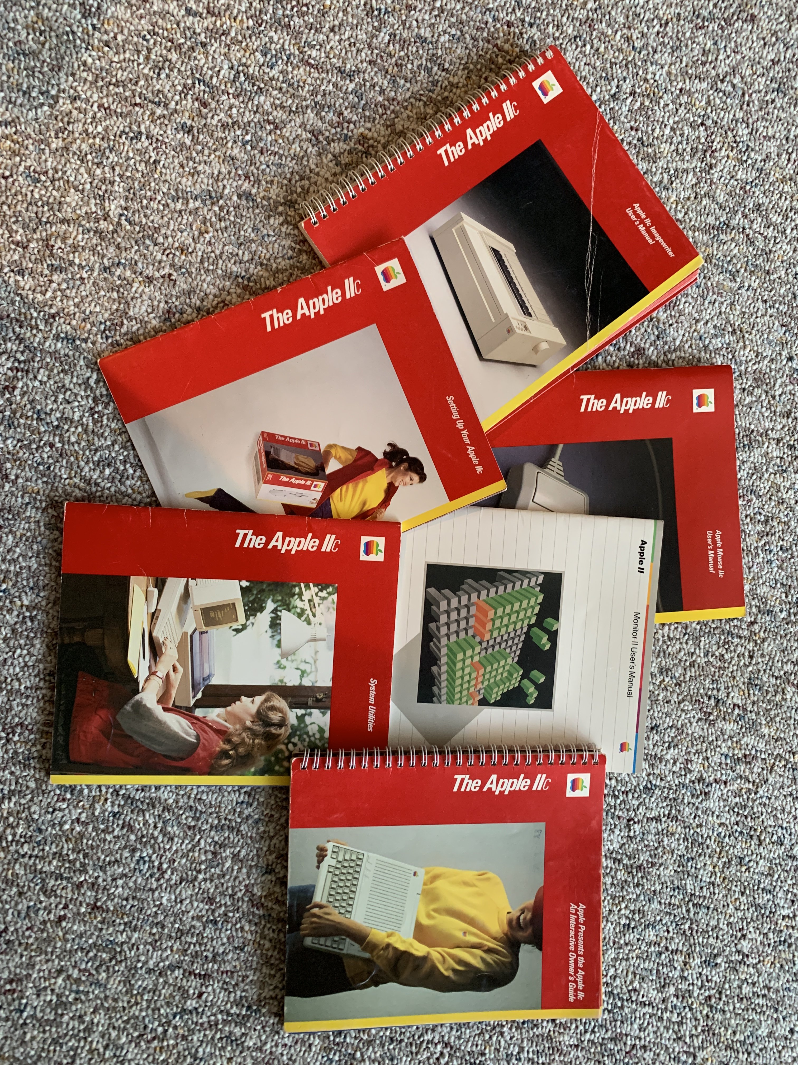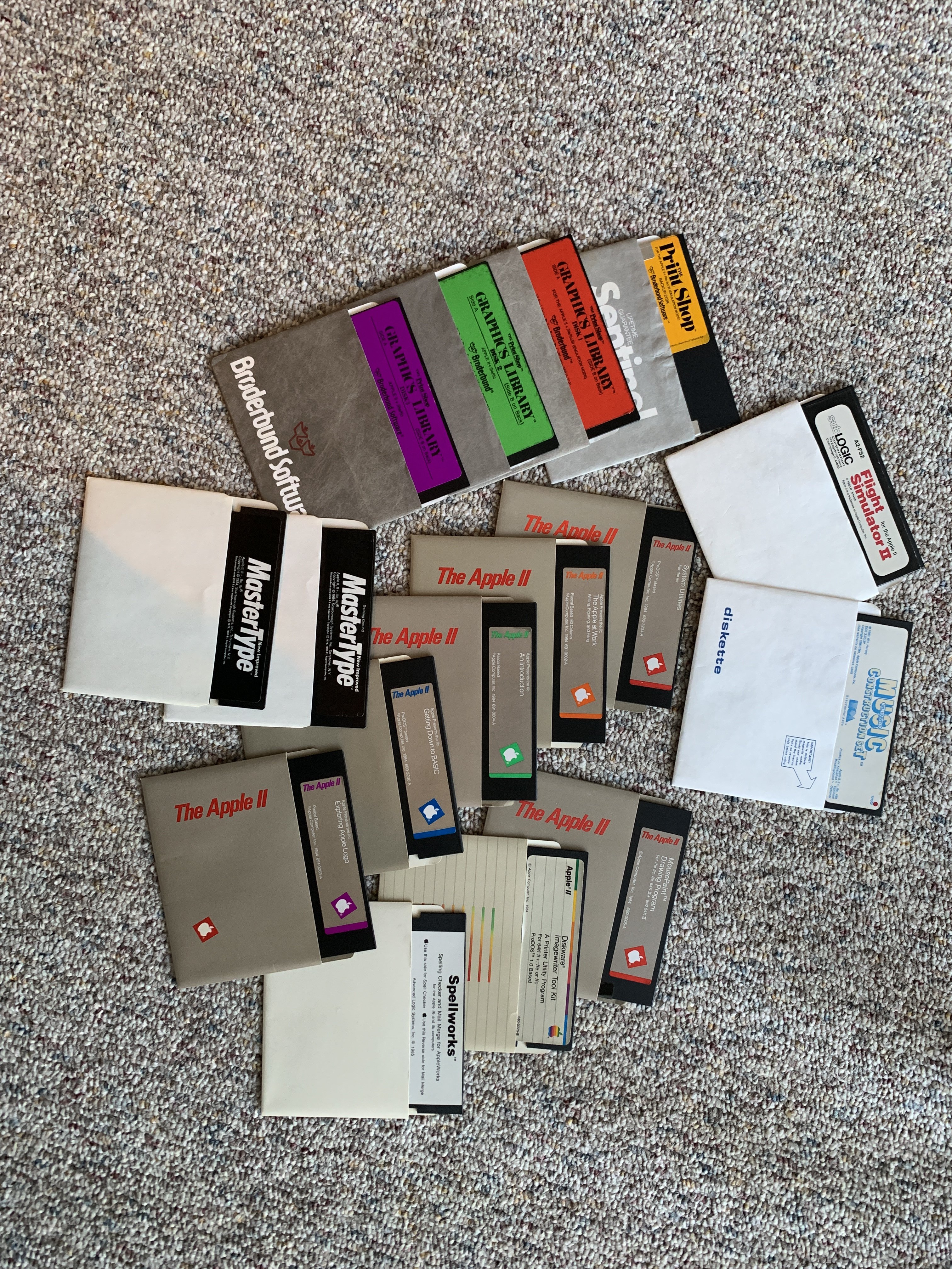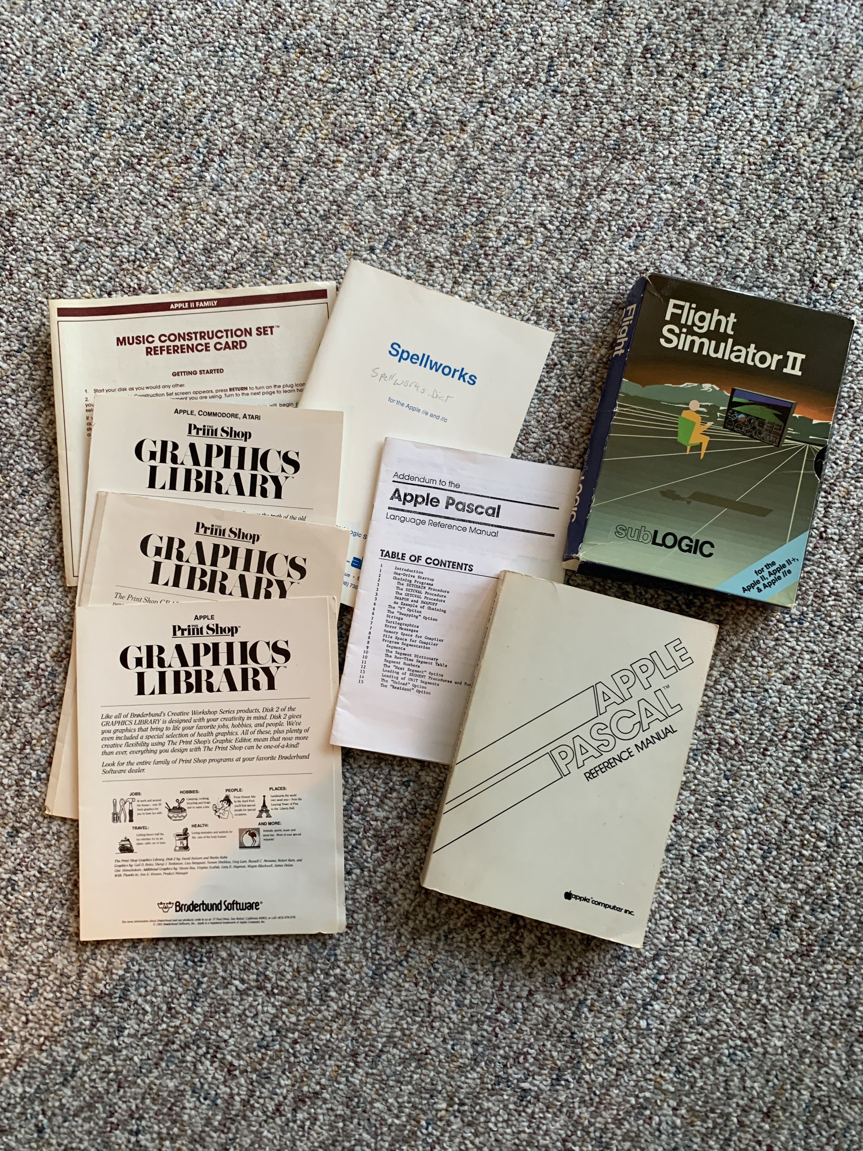 This is the full set of Apple //c System manuals and floppies, along with software such as the old Flight Simulator II, Spellworks, MasterType, PrintShop and Graphics Libraries, Apple Pascal, and Music Construction Set. There's Imagewriter stuff, too. I have no idea if the disks are still readable.