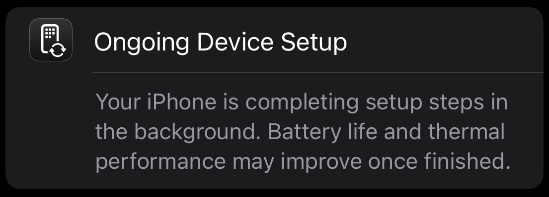 Your iPhone is completing setup steps in the background. Battery life and thermal performance may improve once finished.