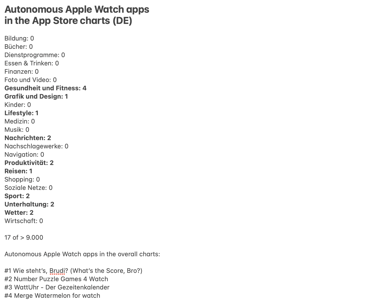Seventeen. Only 17 of over 9,000 Apps in the category charts of the German Apple App Store are autonomous Watch Apps. 180 days before the launch of watchOS 10, apps developed specifically for the Watch are absolute niche products. This is also due to Apple: