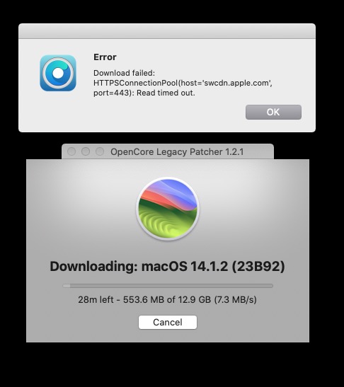 I have absolutely the same problem. I have an iMac 27", late 2012. I was able to follow the instructions so far. However, I get the error in the opencore legacy patcher (error the same in all versions): "Download failed: HTTPSConnectionPool(host='swcdn.apple.com', port=443): Read timed out." Does anyone have a solution to the problem?