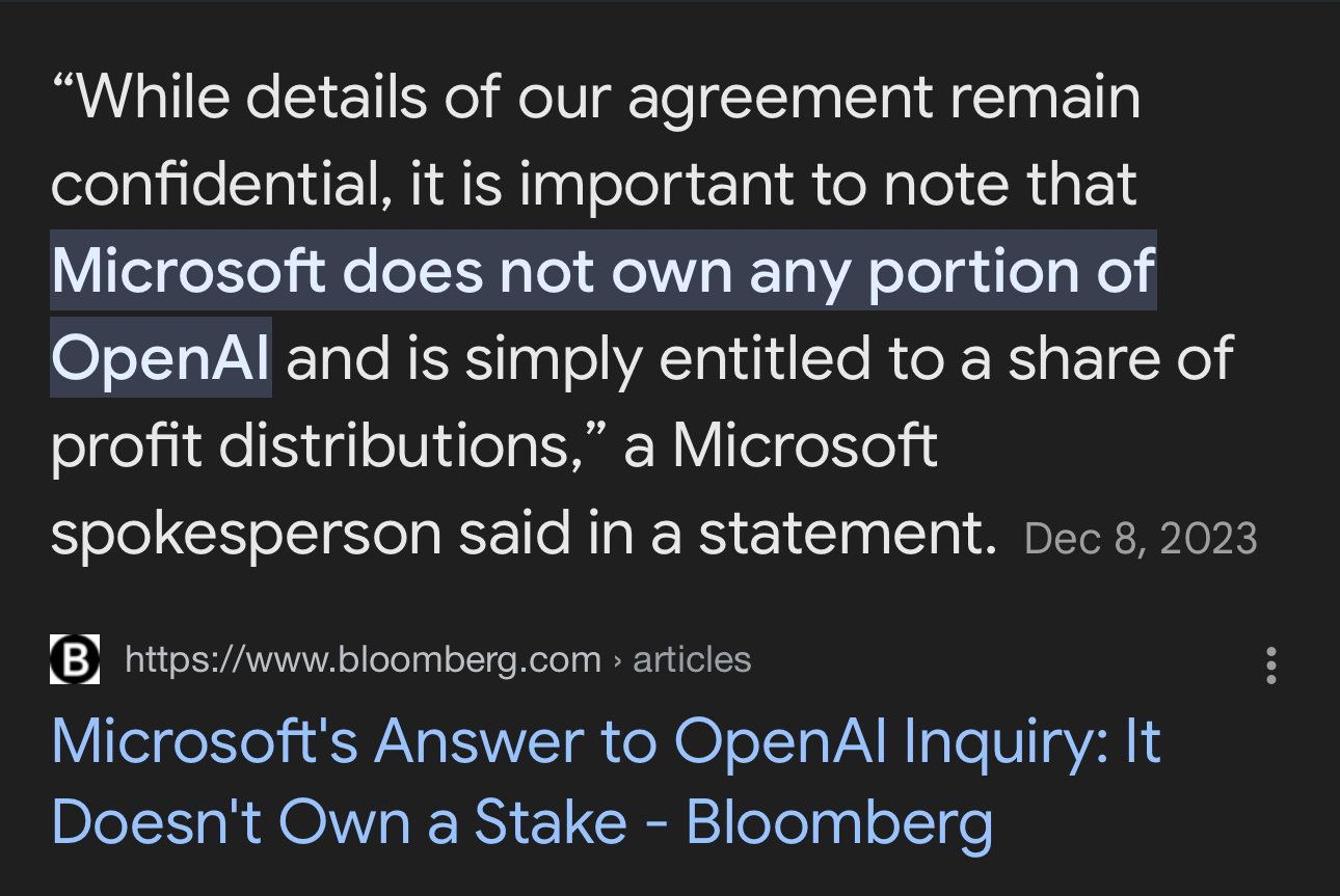 As I understand, they don’t own any of OpenAI, it’s just an agreementSeems unlikely given that Microsoft owns half of OpenAI.