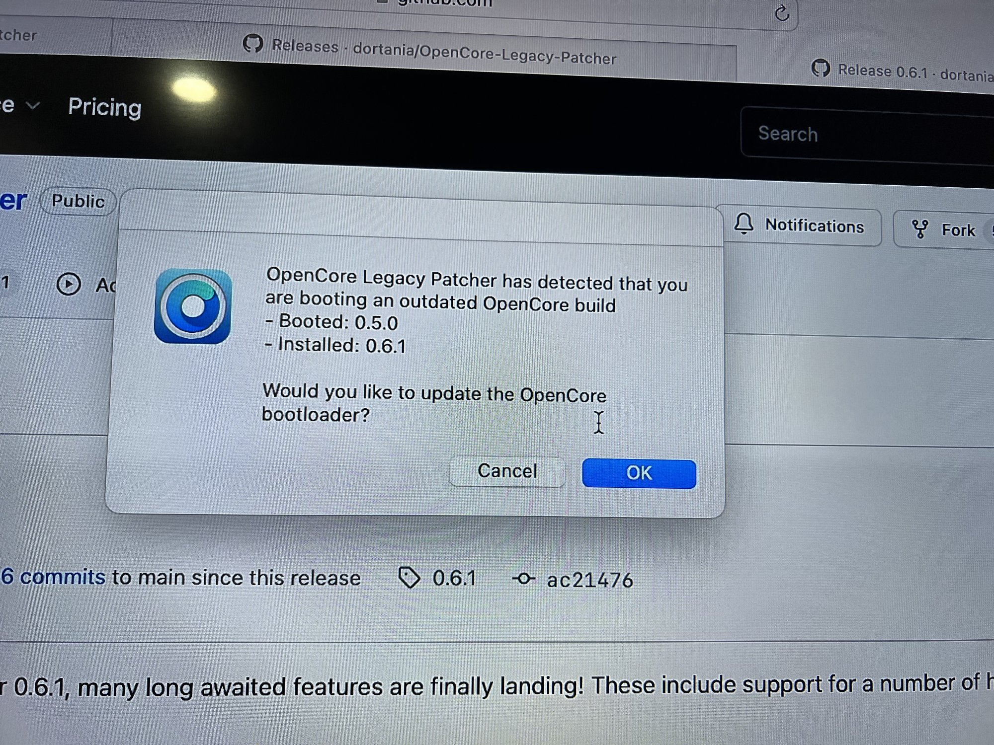 AdamDonner macrumors newbie Original poster Aug 27, 2021 9 1 World Traveler Feb 6, 2023 #1 Hello After upgrading my Mac to o’clock 6.1 I am getting the message opencore legacy patcher booted an outdated build. Booted 5.0 installed 6.1. See attached pic. Any ideas on how to fix this? Attachments 1CD5D1ED-D962-4ACE-98B8-BA53A10528BD.jpeg 792.5 KB · Views: 243