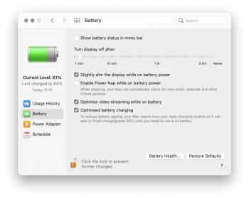 Apologies if this has been covered already. Is the new optimized battery charging in Big Sur smart enough to understand if your Macbook is always connected to power? In which it will always keep it at some battery level below 100%?