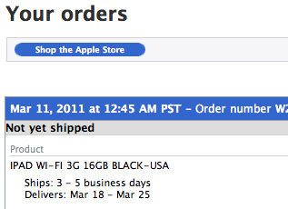 Or I could luck my way into pick one up at an Apple store tomorrow morning. (less than 5% chance I'm sure, but worth a shot). And then return, cancel, or sell the Apple.com shipped iPad 2.