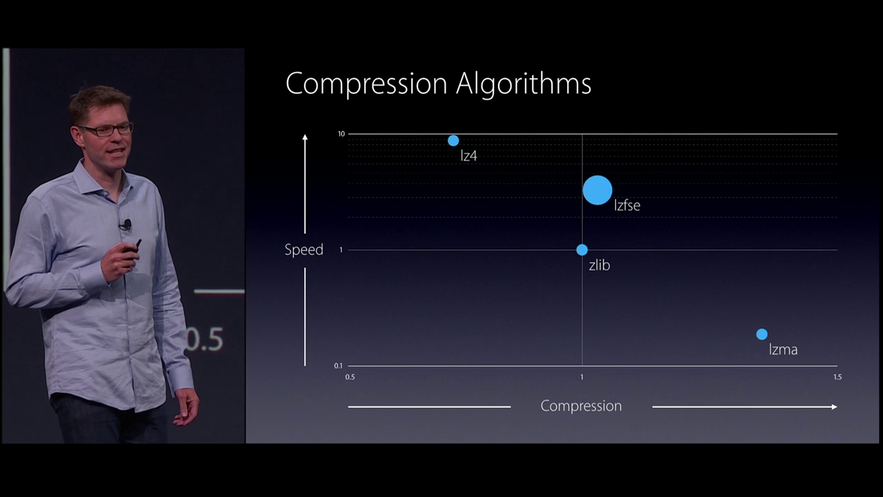 According with the graph shown in the slide, lzfse is both faster and more compressed than zlib.Any cons? What about the size itself? Generally it is safe to assume that the faster it is, the bigger the result will be.