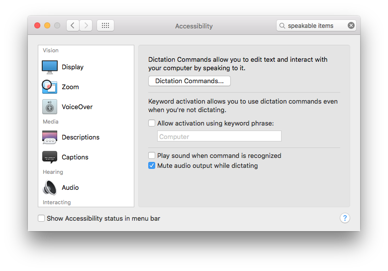 The custom keyword feature has been there at least since Mavericks. Playing a sound upon recognition is also not new (present in Tiger). But nonetheless, nice that Apple keep improving the accessibility features!The "Show numbers" command is also new in El Capitan and I think it's a nice feature. Also new in El Capitan, you can use a custom keyword to activate Dictation, play sound when a command is recognised and mute audio output while dictating.